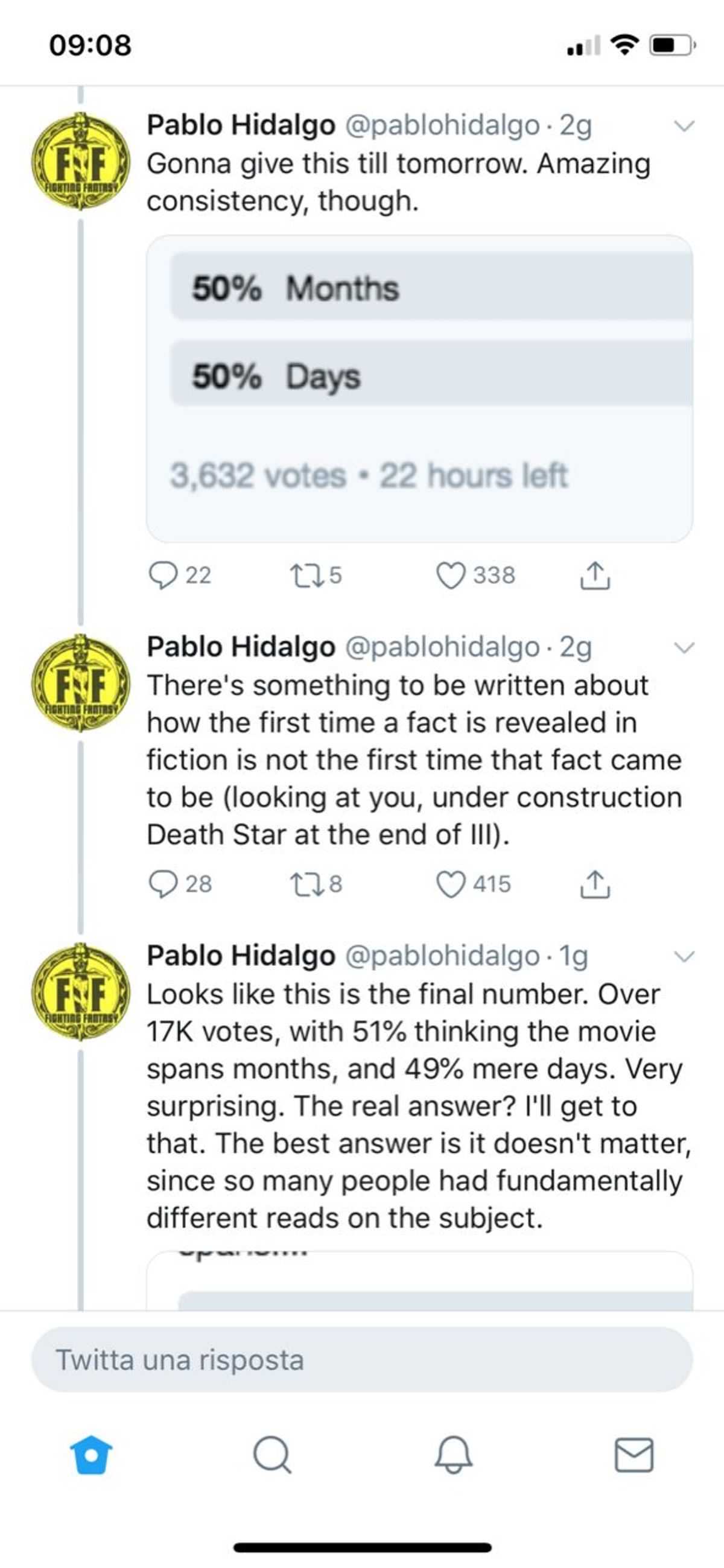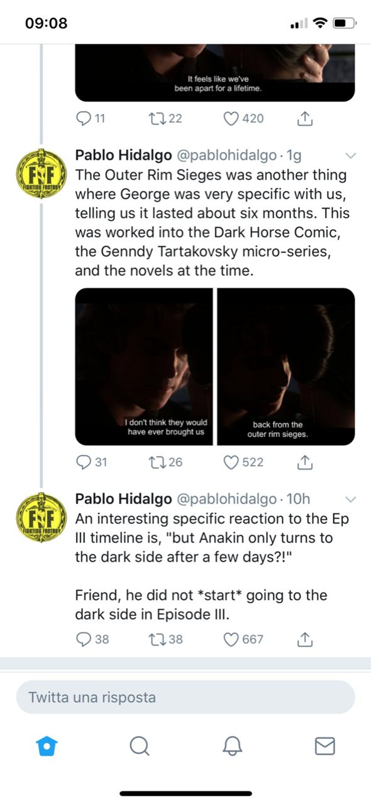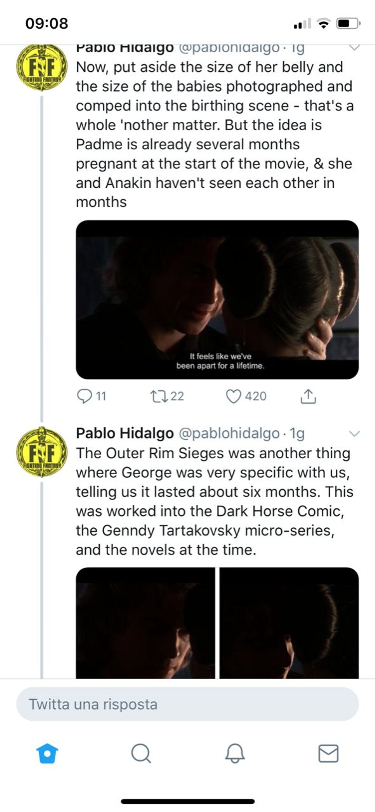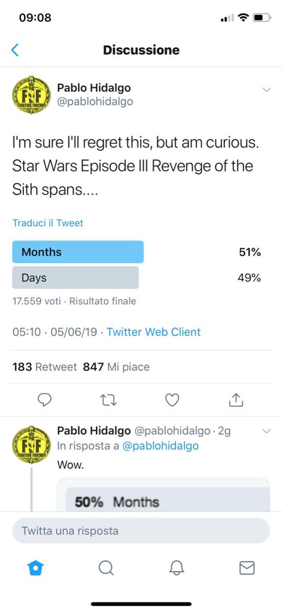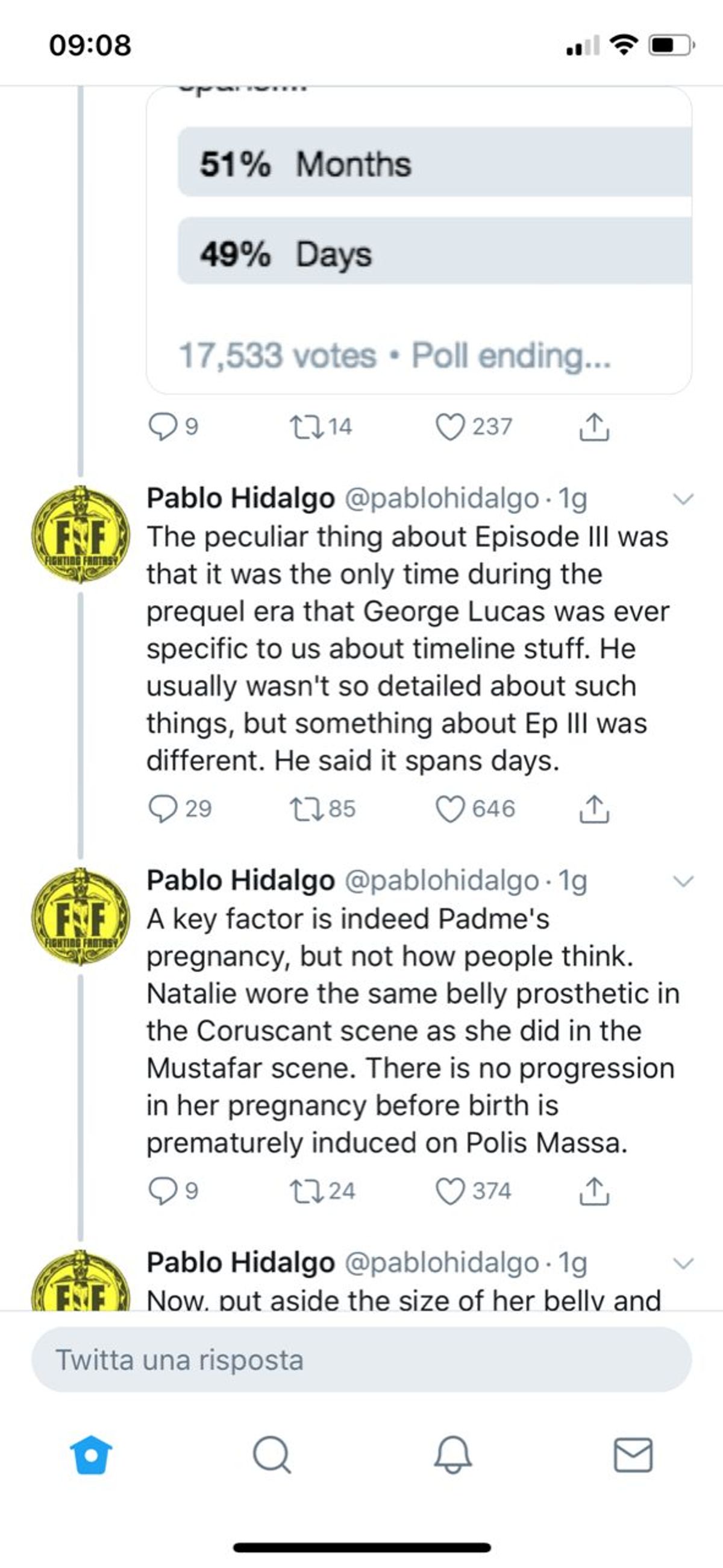 Una volta terminato il sondaggio, Hidalgo ha raccontato di come George Lucas, ai tempi della Trilogia dei Prequel, con l'Episodio III sia stato inusitatamente specifico - con lo storygroup - in materia di dettagli temporali puntualizzando che il lungometraggio si svolge nell'arco di qualche giorno. La gravidanza di Padmé era già in fase avanzata all'inizio della pellicola, a prescindere dal parto prematuro. Hidalgo puntualizza anche che, logicamente, il passaggio di Anakin al Lato Oscuro non avviene nell'arco dei pochi giorni in cui si svolge La Vendetta dei Sith. Si trattava di un percorso già avviato dal futuro Sith.Considerata l'abitudine di Hidalgo di pulire periodicamente il suo storico di Twitter, abbiamo catturato il tutto con degli screenshot che trovate qua sotto: