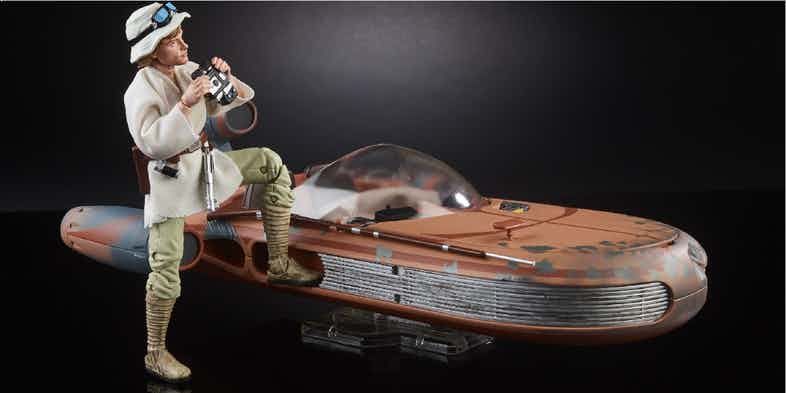 Ecco la figure della Black Series della Hasbro di Luke Skywalker insieme al suo Speeder da Star Wars: Episodio IV - Una Nuova Speranza