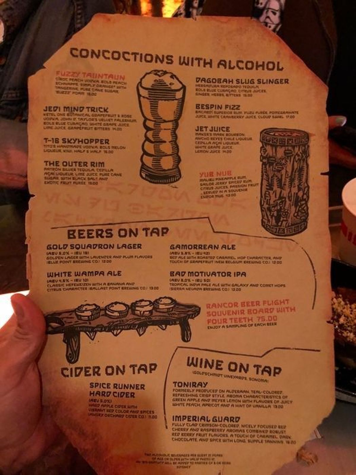 La variante più costosa consiste in una sorta di degustazione di varie birre (tra cui la Sierra Nevada Tropical IPA, la New Belgium Red Ale, la Blue Point Lager, e la Ballast Point IPA) servite in un particolare vassoio di legno con dei denti di Rancor intagliati.Il drink singolo più costoso è il Yub Nub ($42), una bevanda al rum speziata e servita in una tazza a tema Endor che presenta dei simboli decorativi riconducibili al villaggio degli Ewok.