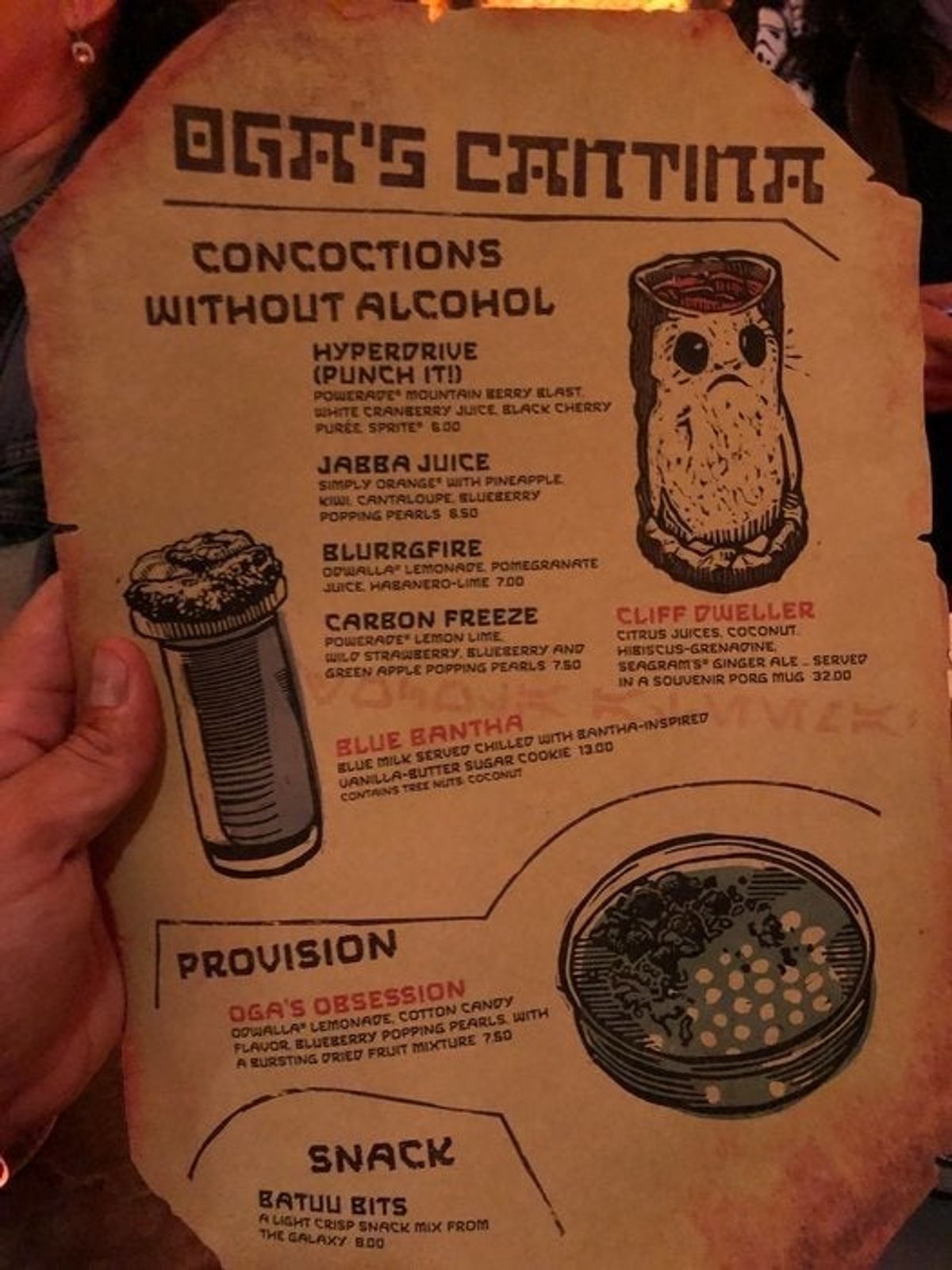 C'è poi il Cliff Dweller ($32), un drink analcolico servito in una tazza souvenir a forma Porg: un ginger ale mescolato con succo di agrumi, cocco e una sorta di granita al sapore di ibisco.Qua sotto potete vedere le foto della Cantina ed alcuni drink:
