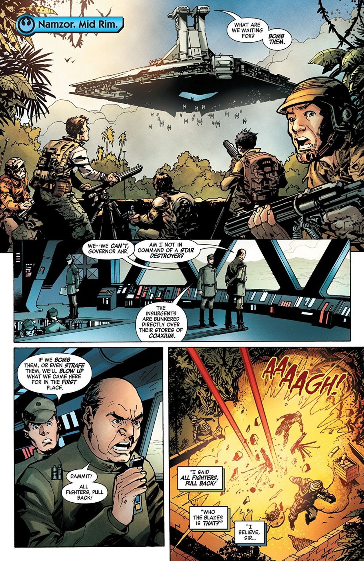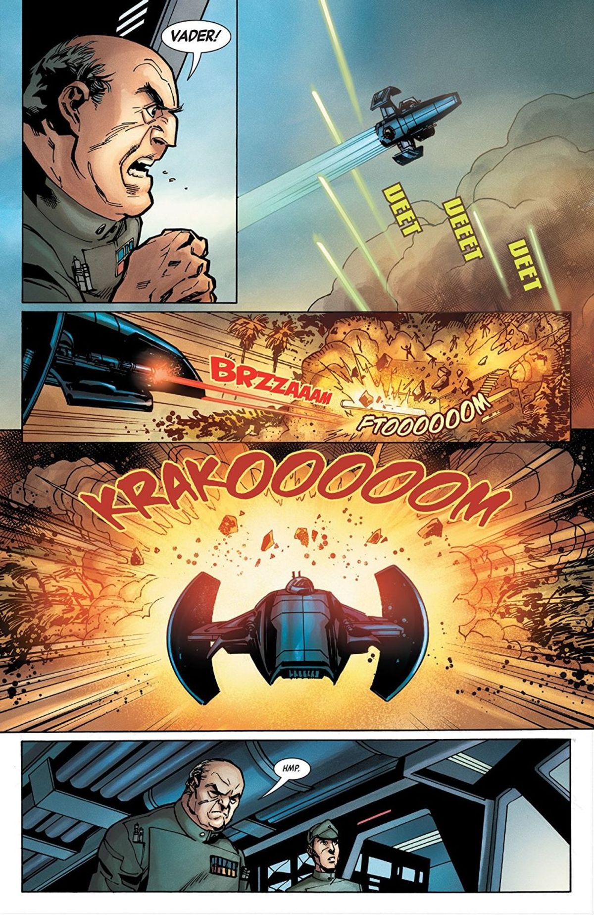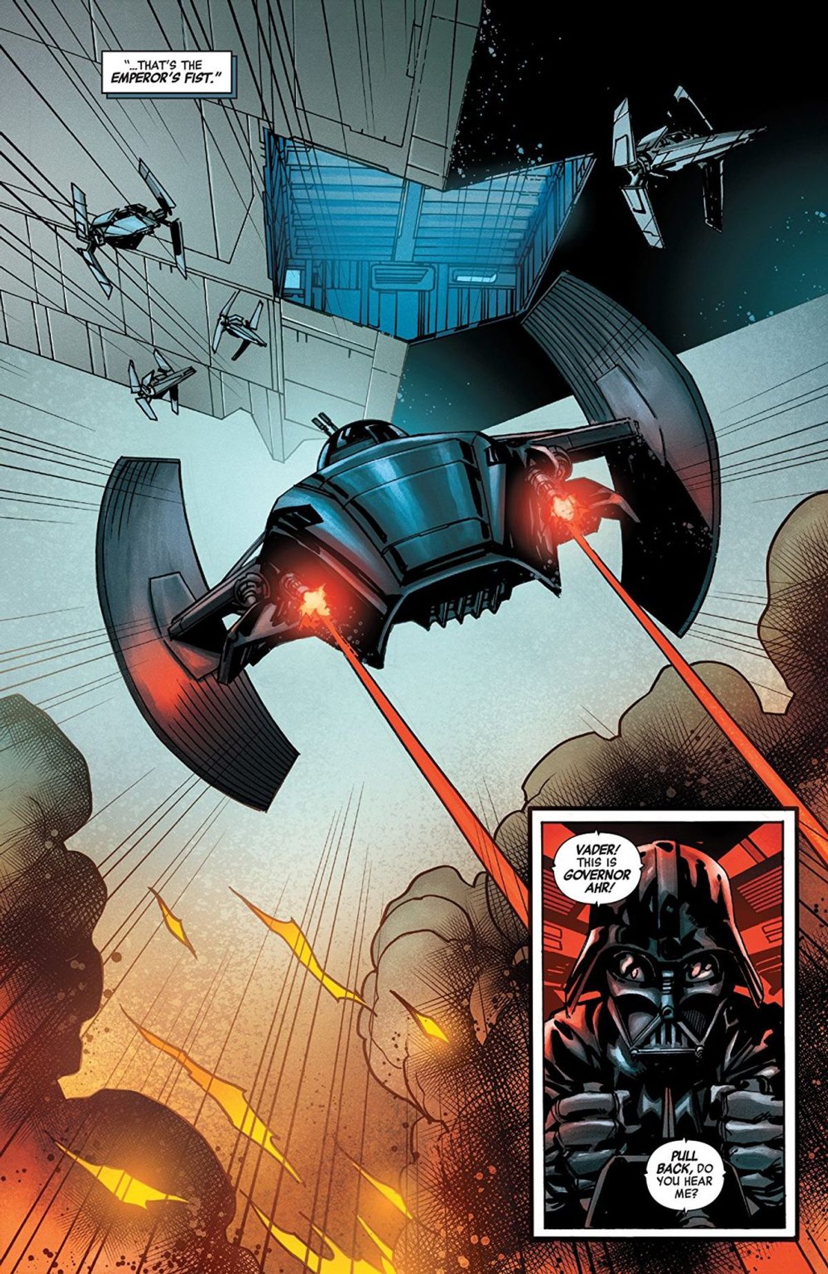È stato bellissimo lavorare con Ramon. Vader è il nostro protagonista, ma non parla poi così tanto. Quindi, Ramon ha fatto un lavoro incredibile nel trasmettere i suoi minacciosi silenzi, evidenziando la rabbia dietro a quella maschera e lasciandosi andare quando arriva il momento dell'azione. Ha disegnato alcune grandiose splash page d'azione, così evocative ed efficaci che, per quanto mi riguarda, non è stato necessario aggiungere alcun balloon o didascalia. Sono fantastiche, e se la storia verrà ristampata sono certo che una di queste ne diventerà la copertina, che avrete voglia di staccare e appendere al muro.