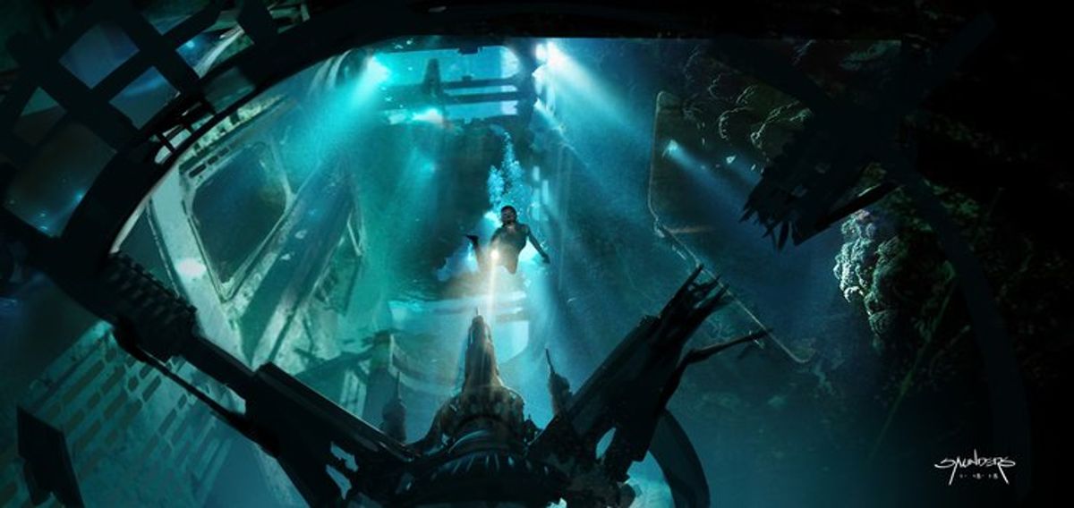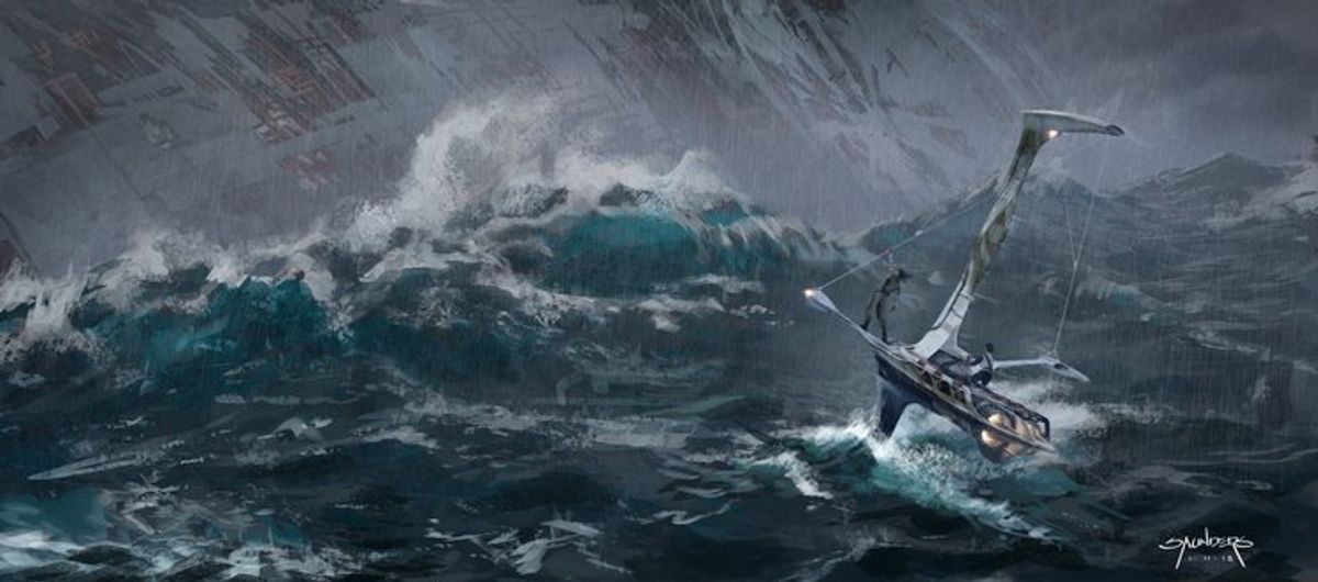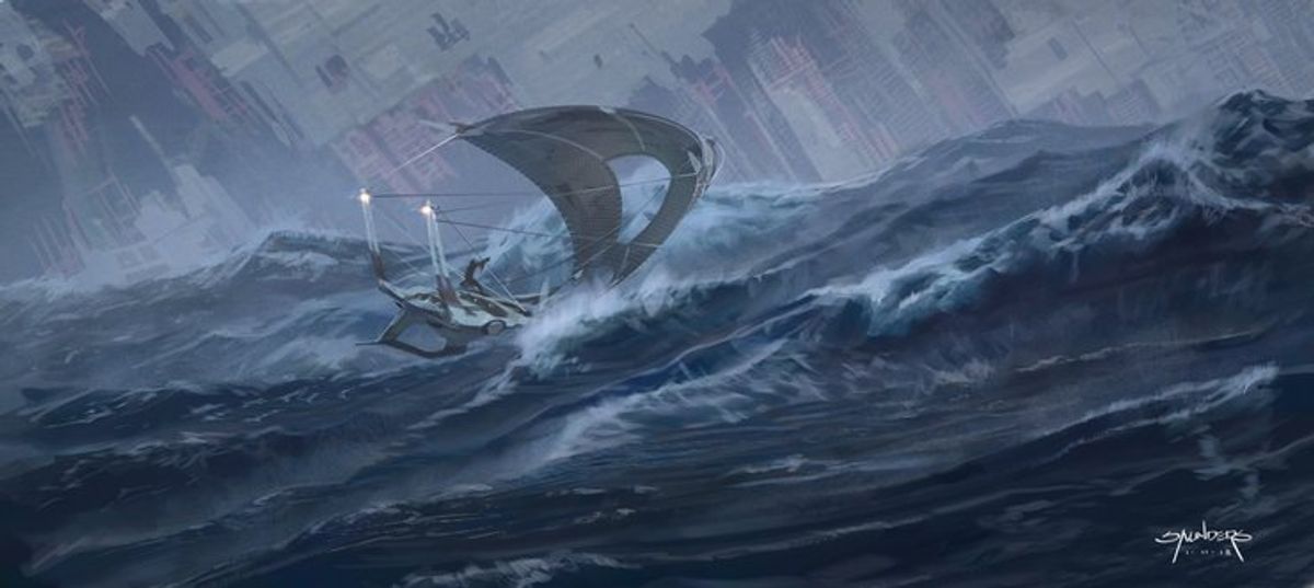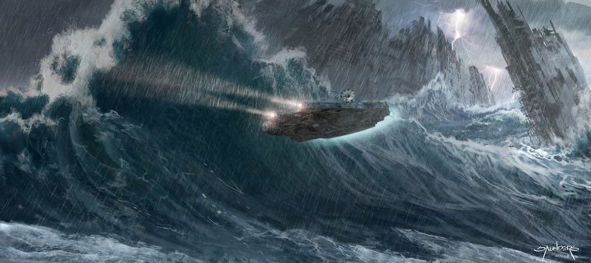 Nelle opere possiamo vedere un design alternativo della piccola astronave che Rey utilizza per arrivare nel relitto della seconda Morte Nera, ma anche il Millennium Falcon che sorvola il relitto nel mare in tempesta.