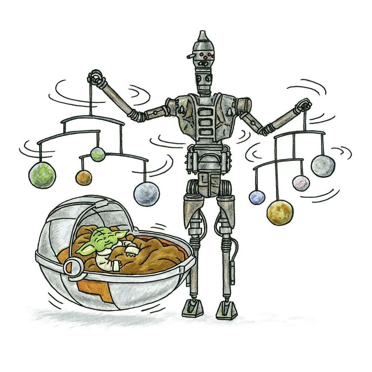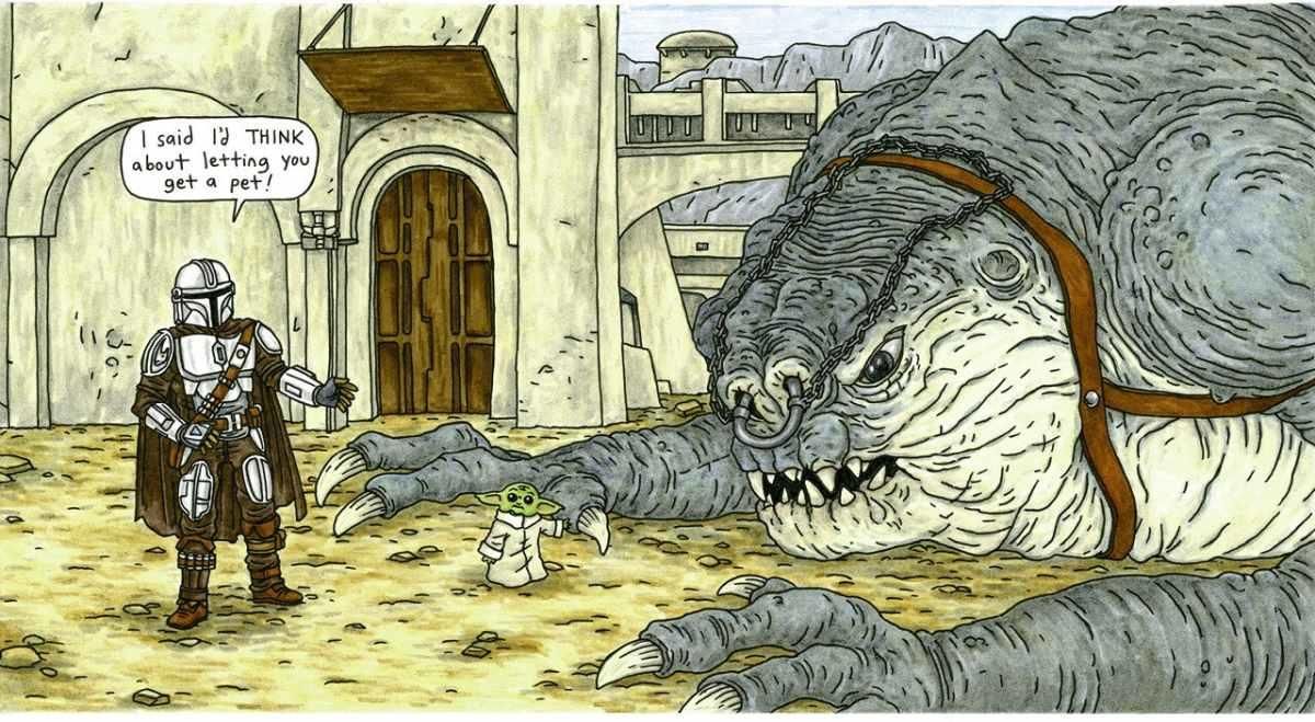Le tre stagioni di The Mandalorian sono disponibili su Disney+.Anni prima della premiere della serie Mandalorian, qualcuno mi ha chiesto di disegnare Yoda da bambino, quindi l'ho semplicemente disegnato con un pannolino. Non avevo idea che un giorno avrei visto uno show con 'Baby Yoda' - ma mi è piaciuto vedere Grogu diventare molto di più. Riuscire a costruire la mia interpretazione di Mando e Grogu è piacevolmente divertente, e il modo in cui la loro relazione mescola amicizia e famiglia è il tipo di sensazione che amo mettere nel mio lavoro. Soprattutto quando si tratta di disegnare droidi IG, assaltatori, rancor, e Boba Fett, ovviamente!