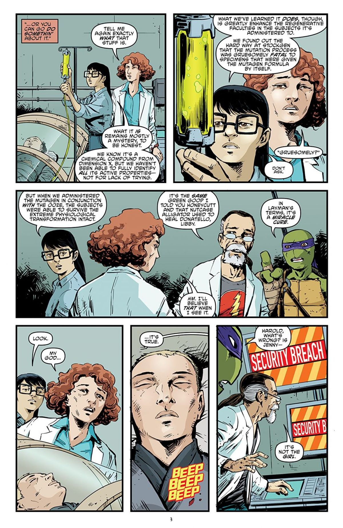 Jennika, questo il nome della ragazza, è stata introdotta nella sua forma originaria da Waltz e Ken Garing nello storyarc Order from Chaos (Teenage Mutant Ninja Turtles #51/55), pubblicato tra l'ottobre 2015 e il febbraio 2016 negli Stati Uniti, ed era inizialmente un membro del Clan del Piede, guidato dall'aricinemico dei protagonisti, Shredder.Il numero #95 di Teenage Mutant Ninja Turtles contiene la terza parte della storia City at War, dove è in atto a New York una guerra tra gang rivali. Durante uno scontro, Jennika viene uccisa da Karai, figlia adottiva e braccio destro di Shredder, che con i suoi tirapiedi impedisce alle Tartarughe di portare l'amica in ospedale. Dopo varie peripezie e vedendo le possibilità di salvare la compagna ridursi al minimo, Donatello decide di trasfondere il sangue di Leonardo nel braccio di Jennika, la quale si salva ma si trasforma in una Tartaruga Mutante.