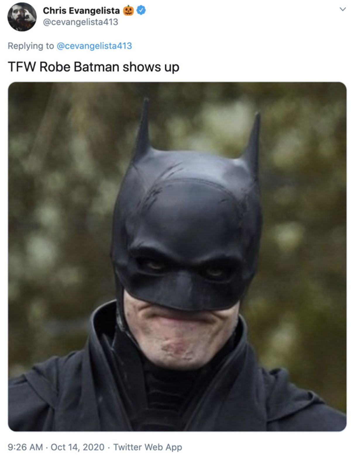 Il 13 ottobre il sito Just Jared ha pubblicato in rete degli scatti provenienti dal set del cinecomic che mostravano il protagonista del film (non Robert Pattinson presumibilmente ma una controfigura) con il costume del Crociato Incappucciato e un lungo accappatoio nero. In seguito il critico Chris Evangelista scrisse un tweet sulla questione ribattezzando il personaggio come "Robe Batman", ricevendo innumerevoli commenti e più di 700 retweet in un solo giorno.