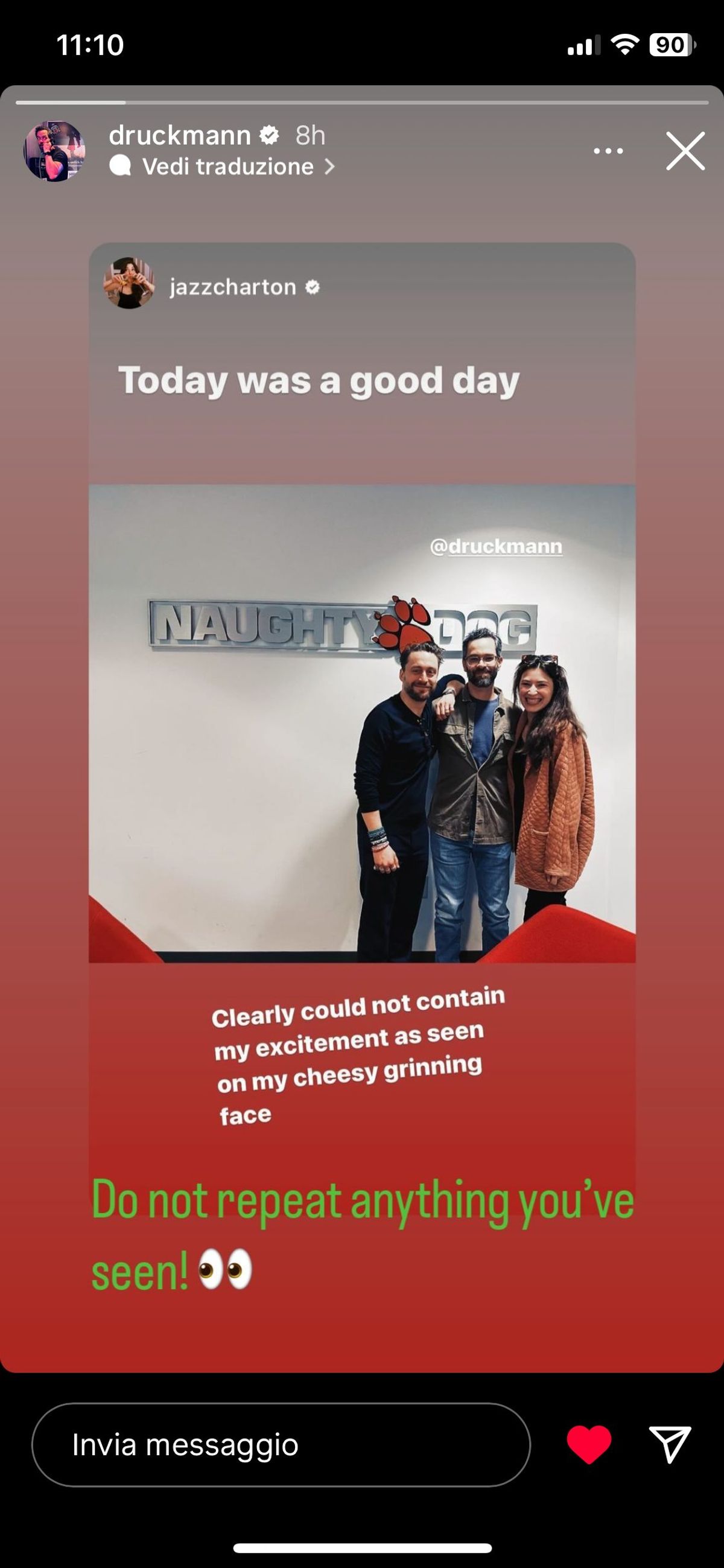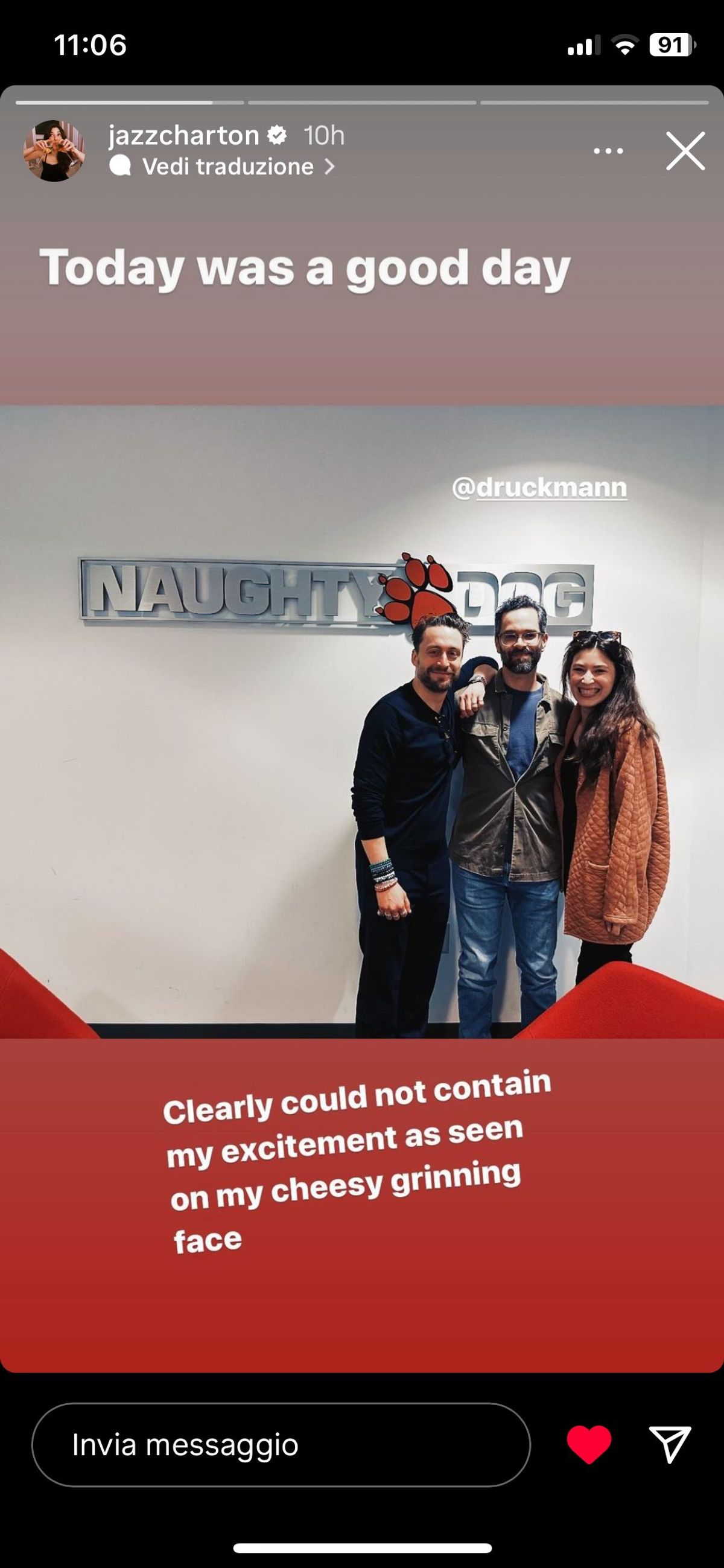 La visita è stata testimoniata da una serie di scatti diffusi su Instagram proprio da Jazz Charton, uno dei quali è stato ripreso anche da Neil Druckmann, presidente di Naughty Dog nonché co-ideatore di The Last of Us e produttore della serie TV. Nella sua storia Druckmann "minaccia" ironicamente i due invitandoli a non svelare nulla di quanto hanno visto e sentito. Chiaramente non sappiamo se si tratti di qualcosa che ha a che fare con la stagione 2 di The Last of Us, con il rumoreggiatissimo terzo capitolo videoludico della saga o con un altro progetto della softco magari ancora tenuto sotto chiave.Ecco a seguire gli screenhsot delle stories: