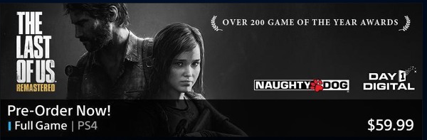 Probabilmente per errore (sarebbe interessante sapere quanto voluto), sul PlayStation Store statunitense è apparso un banner promozionale per The Last of Us: Remastered, versione per PlayStation 4 dell'apprezzatissimo titolo di Naughty Dog, della quale si era a lungo vociferato, e che ora tra la sua conferma. Sony non ha ancora commentato la notizia, ma dai rumour provenienti dai soliti bene informati sembra lo farà presto, annunciando una data d'uscita per giugno 2014.