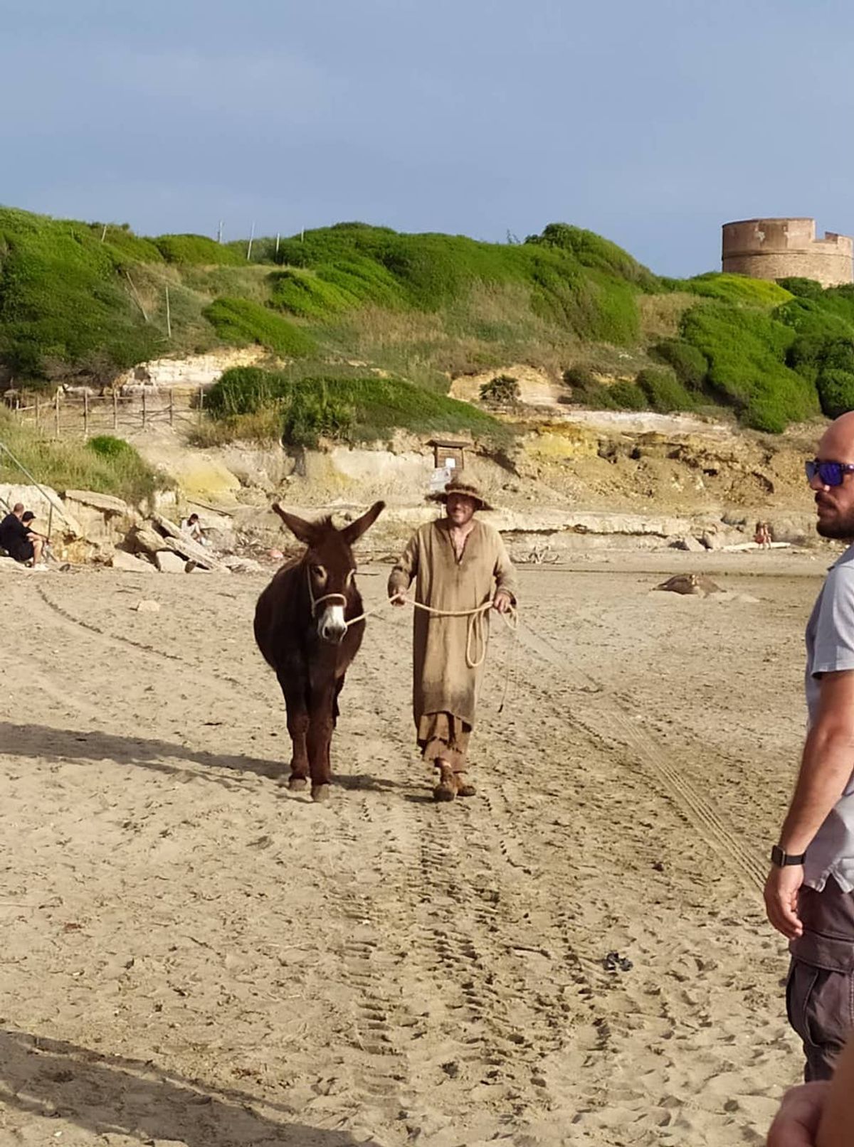 Martina Vitelli era presente oggi sul set del film nella cittadina costiera laziale, e ci ha mandato immagini e video delle riprese di una scena girata al tramonto sulla spiaggia, nella quale un uomo con un asino si avvicina a quello che sembra essere una sorta di volto nella sabbia. Martina ci spiega che sul set è stato detto che "Il film parla dell'umanità, partendo dal Big Bang all'Apocalisse". Secondo le indiscrezioni diffuse qualche giorno fa dal Corriere della Città, la pellicola, a tema storico e religioso, narra diversi passaggi della vita di Cristo e rappresenterà anche parabole evangeliche. Tra le location citate, anche la Riserva Naturale di Tor Caldara e la spiaggia adiacente, utilizzata proprio per le riprese di oggi.