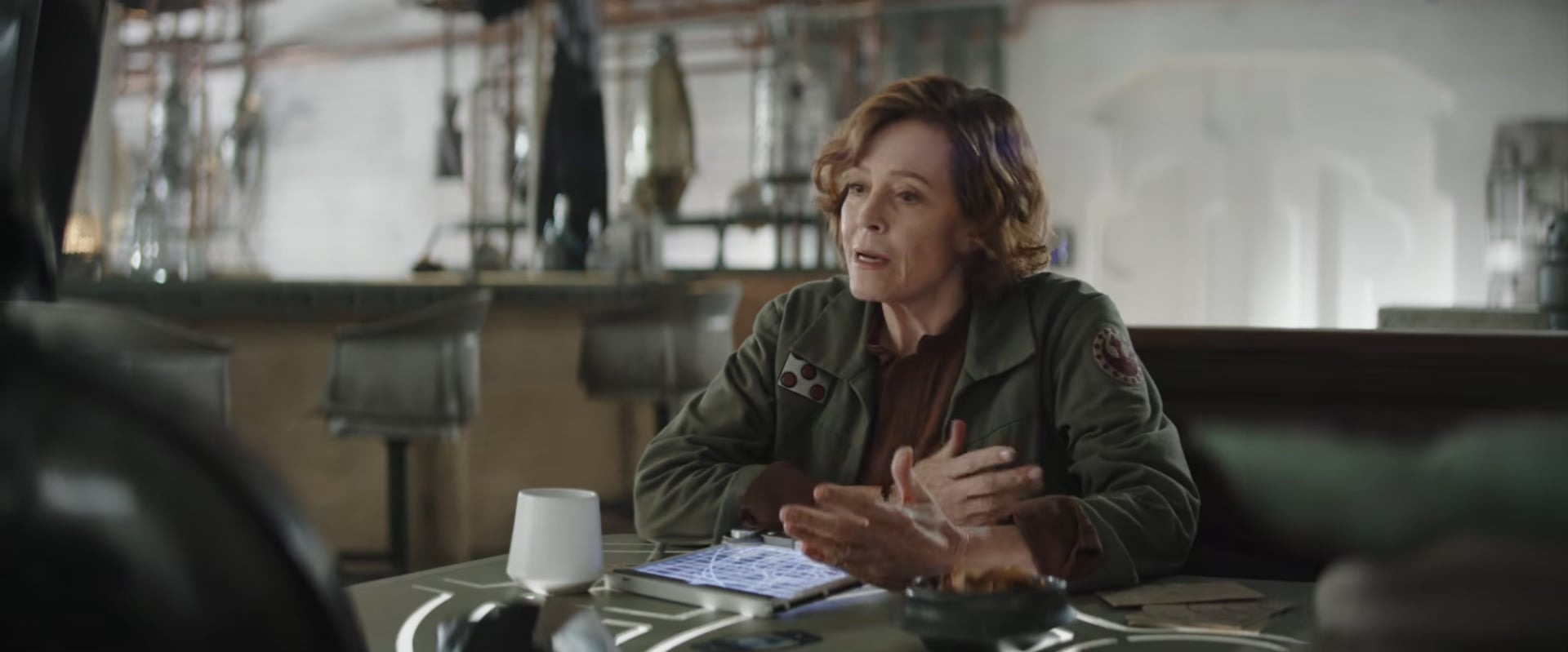 Tornati alla Base Adelphi, Din si presenta al Colonnello Ward, interpretata da Sigourney Weaver, che gli consegna una carta da sabacc. "Elimineremo tutti i cattivi nel tuo mazzo di carte", promette il mandaloriano. Considerando che un mazzo di sabacc contiene 76 carte, Ward ha evidentemente una lista molto lunga di bersagli da neutralizzare. È interessante notare che Grogu, in questa scena, indossa visibilmente il rondello di beskar con il simbolo del mudhorn che l'Armorer ha forgiato per lui nella terza stagione, ora ben in vista fuori dalle sue vesti. Un piccolo ma significativo segno del suo status ufficiale come trovatello mandaloriano.