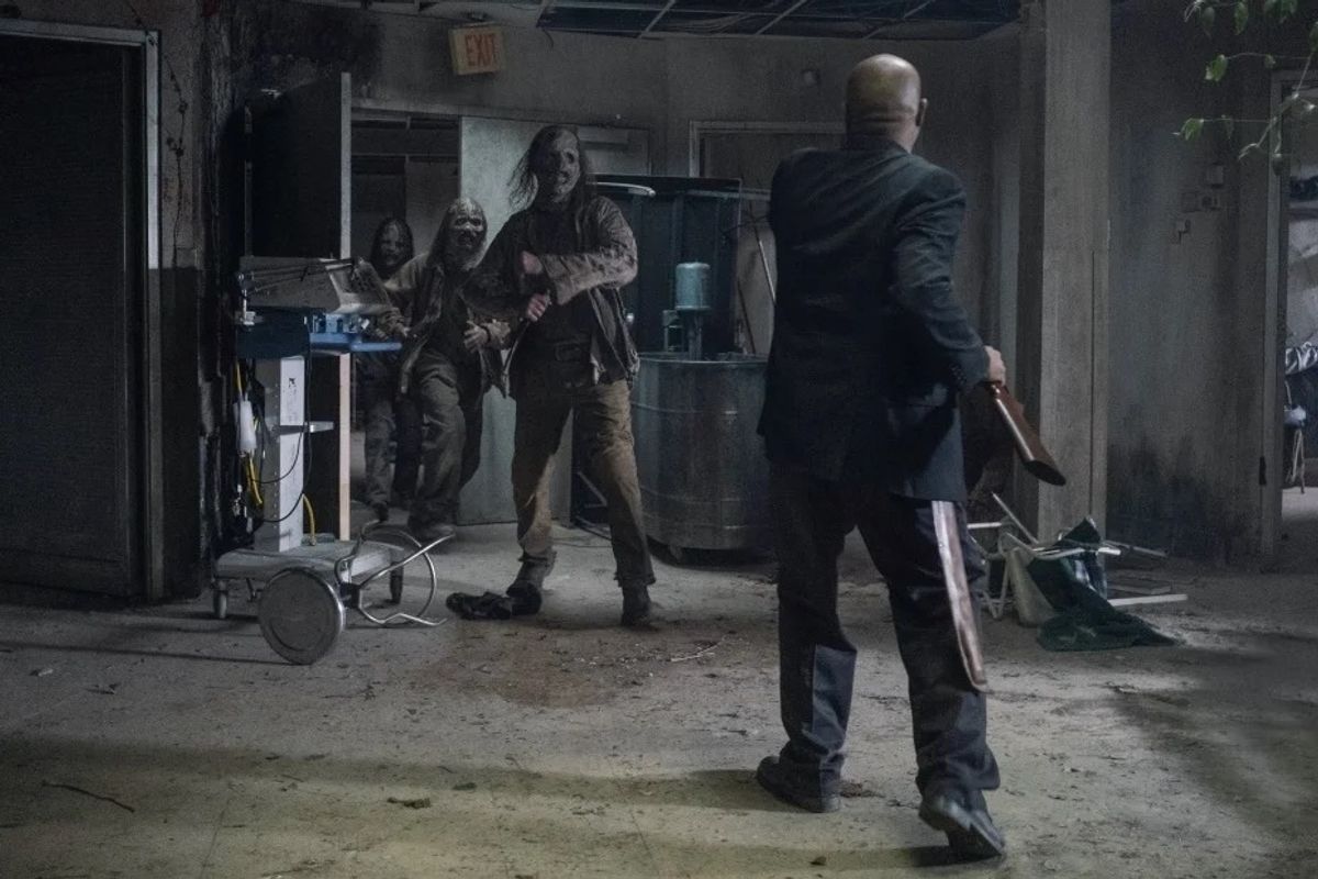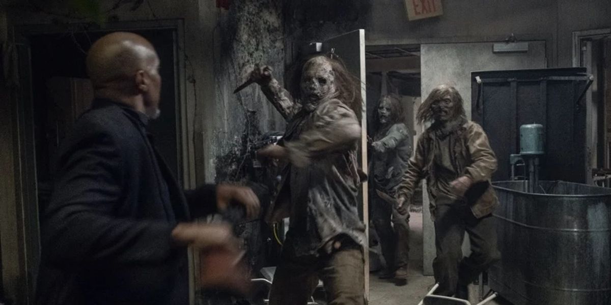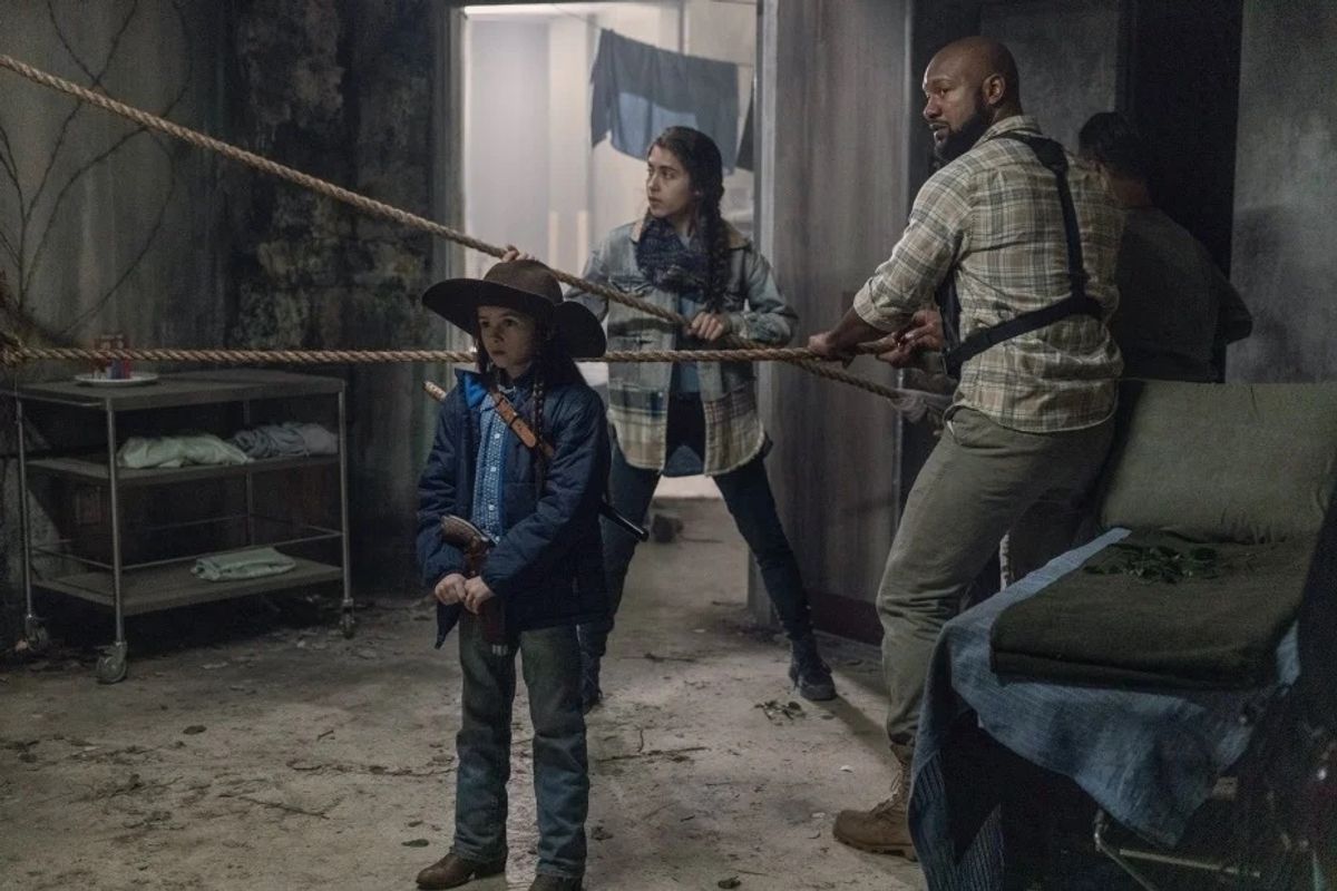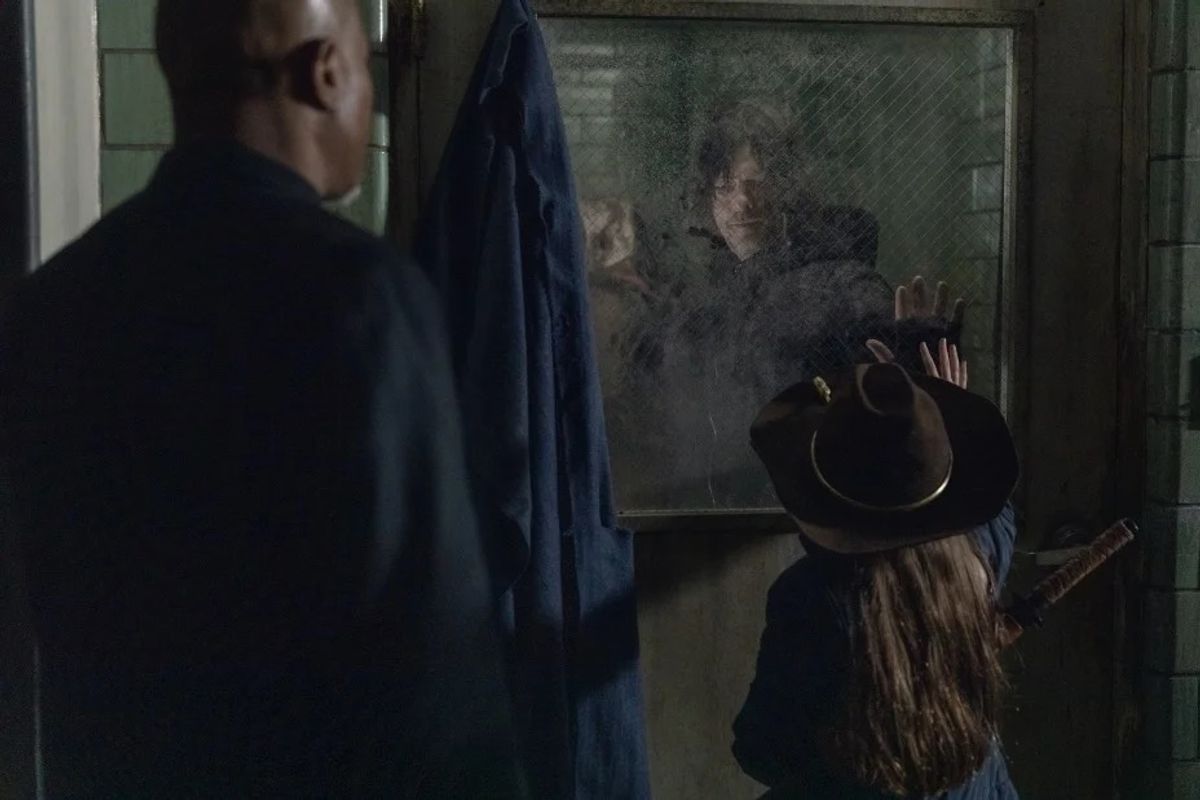 Le nuove immagini lo mostrano infatti in prima linea mentre cerca di difendere chi si trova all'interno dell'edificio circondato dagli zombie guidati da Beta (Ryan Hurst), in particolare i piccoli RJ (Antony Azor) e Judith Grimes (Cailey Fleming).
