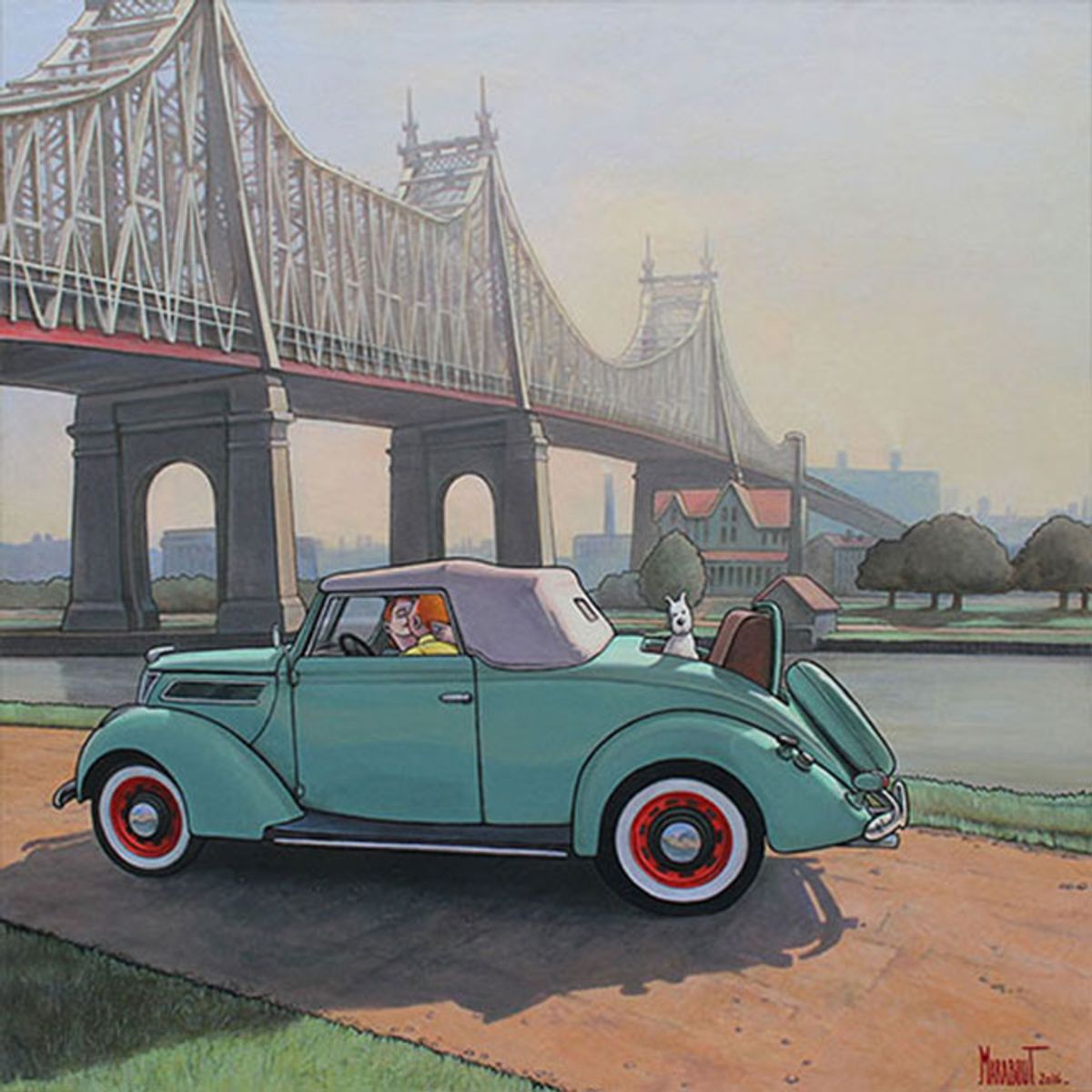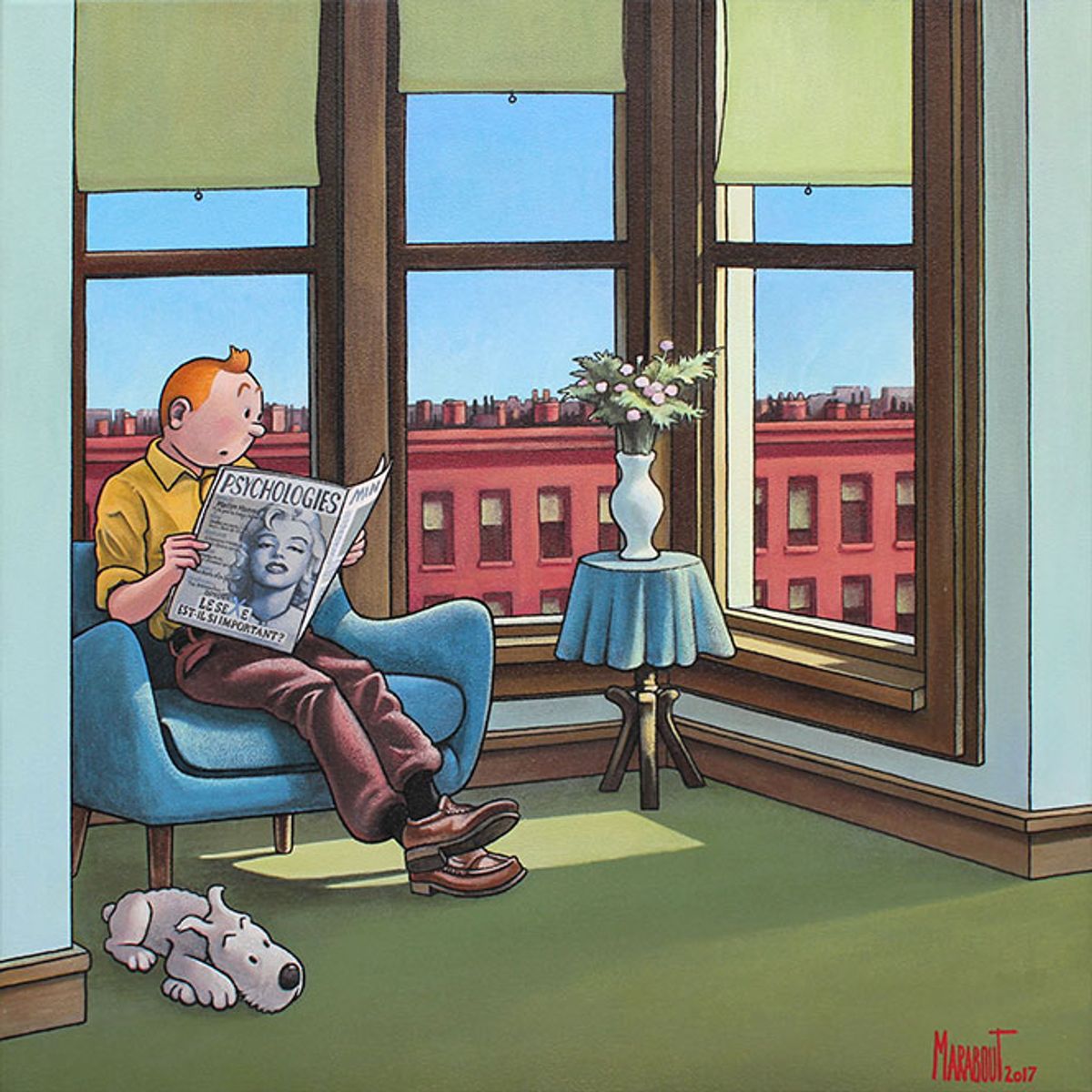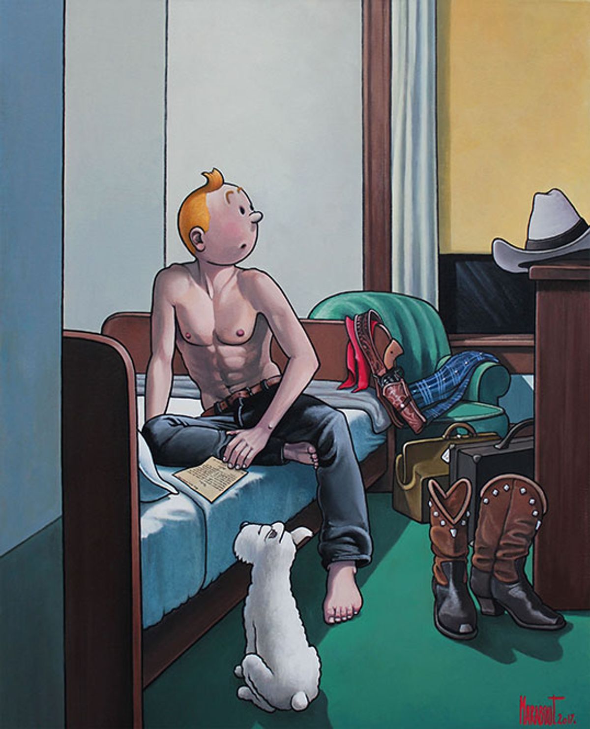 A quanto pare Moulinsart non la pensa allo stesso modo, visto che ha denunciato il pittore, chiamandolo in tribunale. Lunedì scorso l'avvocato dei titolari dei diritti di Tintin ha affermato:Xavier Marabout - Ho subito voluto farlo innamorare, immaginarmi una vita sentimentale per questo personaggio considerato asessuale. E ho sviluppato questa storia nelle tele di Hopper. Quando nel 2015 ho ricevuto una lettera che mi informava di non poter usare l'immagine di Tintin, ho risposto spiegando il mio approccio artistico. Non ho mai fatto finta di non conoscere le regole, conosco l'atteggiamento dei titolari dei diritti nei confronti dell'opera, ma non credo di essere dannoso per il lavoro di Hergé. Anzi, ne alimento il mito.
