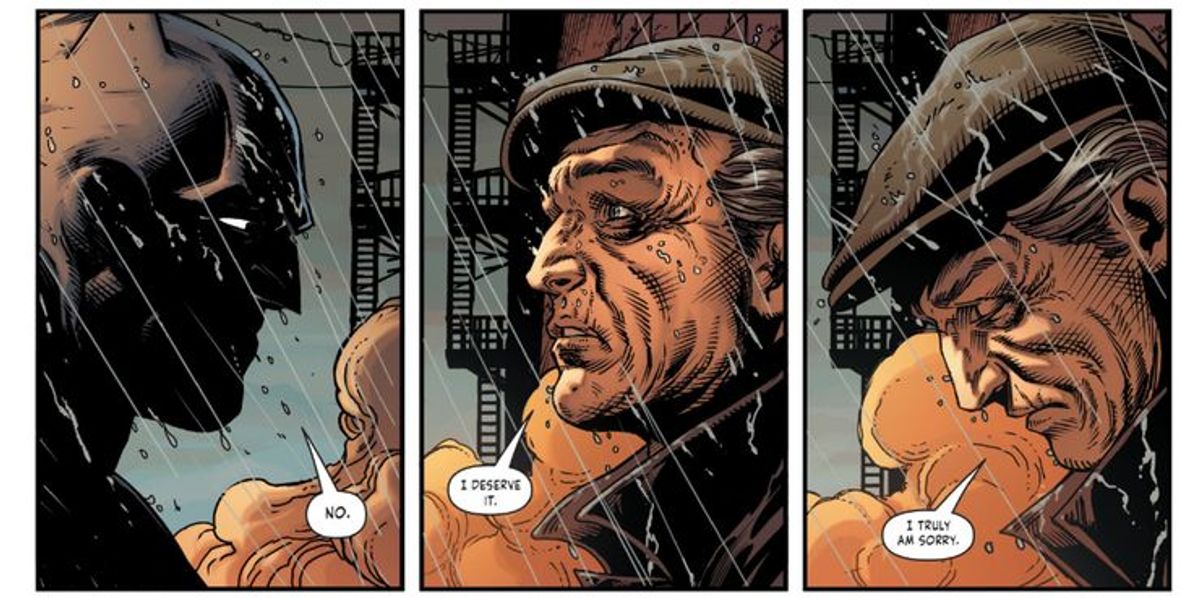 Fabok - E pensate all'impatto che questo ha su Batman. Se lui vede benissimo che c'è speranza, che l'uomo che ha distrutto la sua vita è in grado di cambiare la propria, se Bruce Wayne può perdonare quella persona e riappacificarsi con lui, che cosa farà, come personaggio, in futuro? Come cambia il modo in cui combatte il crimine? Ora c'è una speranza del tutto diversa nella sua vita. Da tutta la vita evita di uccidere i suoi nemici, cerca di riabilitarli. E, guarda un po'... c'è riuscito. Ha vinto. Joe Chill è recuperato e questo cosa significa per il percorso di Bruce Wayne? Si tratta di un concetto molto potente.