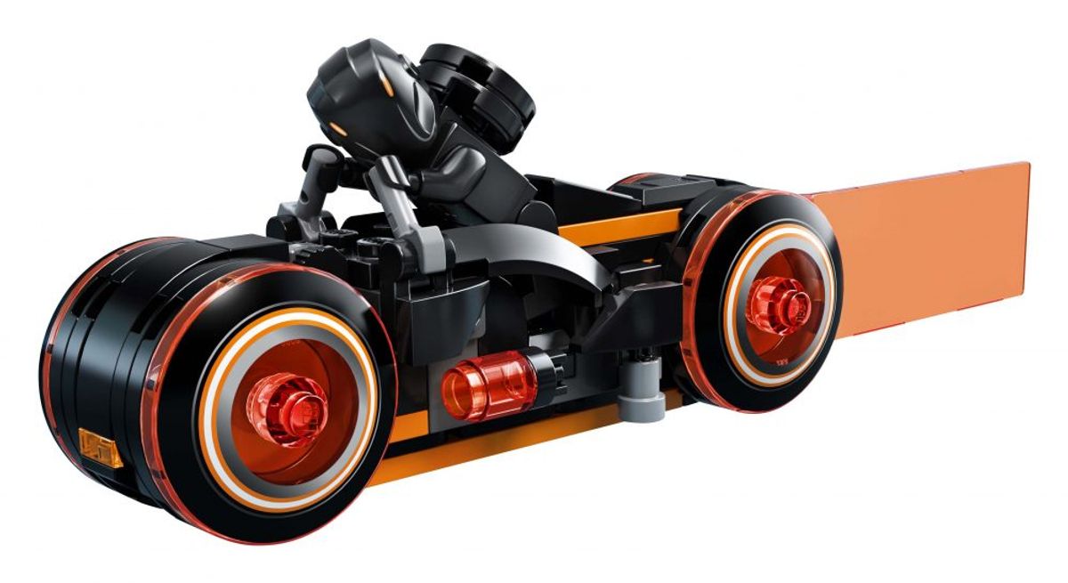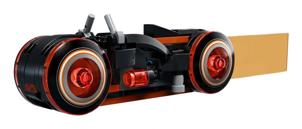 La Moto di luce di Rinzler è dotata di sedile per minifigure, dettagli autentici ed elementi luce arancioni trasparente, incluso gli effetti “power stream”.