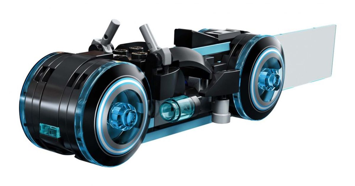La Moto di luce di Sam Flynn è dotata di sedile per minifigure, dettagli autentici ed elementi luce blu trasparente, incluso gli effetti “power stream”.