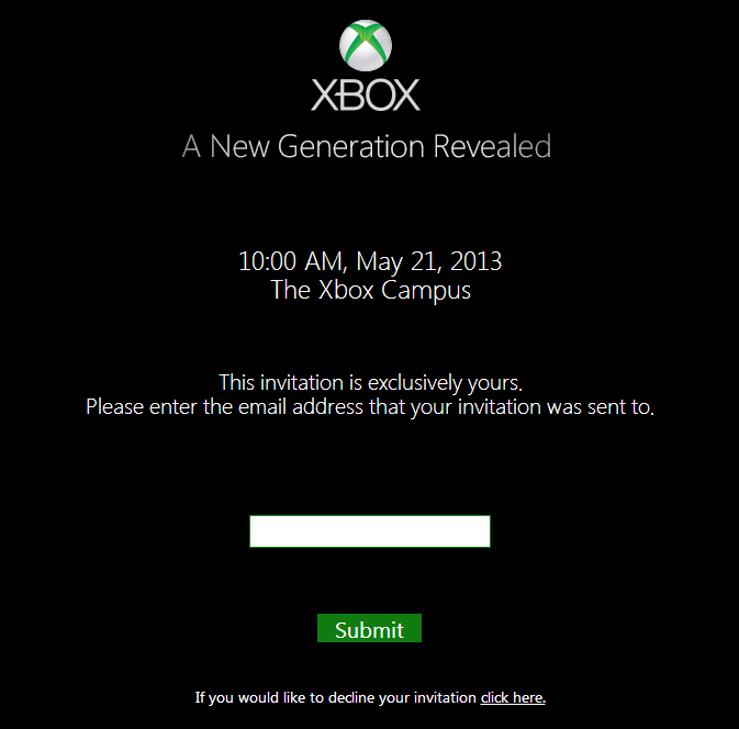 La data è quella del 21 maggio: l'evento, che verrà trasmesso in livestreaing su Xbox Live, Xbox.com e Spike TV, si terrà alle ore 10 del mattino (ora del pacifico). Questo l'annuncio:Durante l'evento verrà annunciato l'inizio di una "nuova generazione di giochi, TV e intrattenimento. [...] In quel giorno condivideremo la nostra visione sull'Xbox e vi daremo un assacio del futuro. Poi, 19 giorni dopo all'E3, continueremo la conversazione e vi mostreremo la nostra lineup di blockbuster".Una Nuova Generazione Rivelata. Sii parte di questo storico evento online che includerà live streaming, video, immagini, aggiornamento e molto altro.