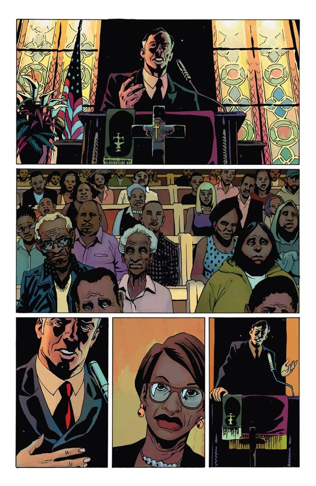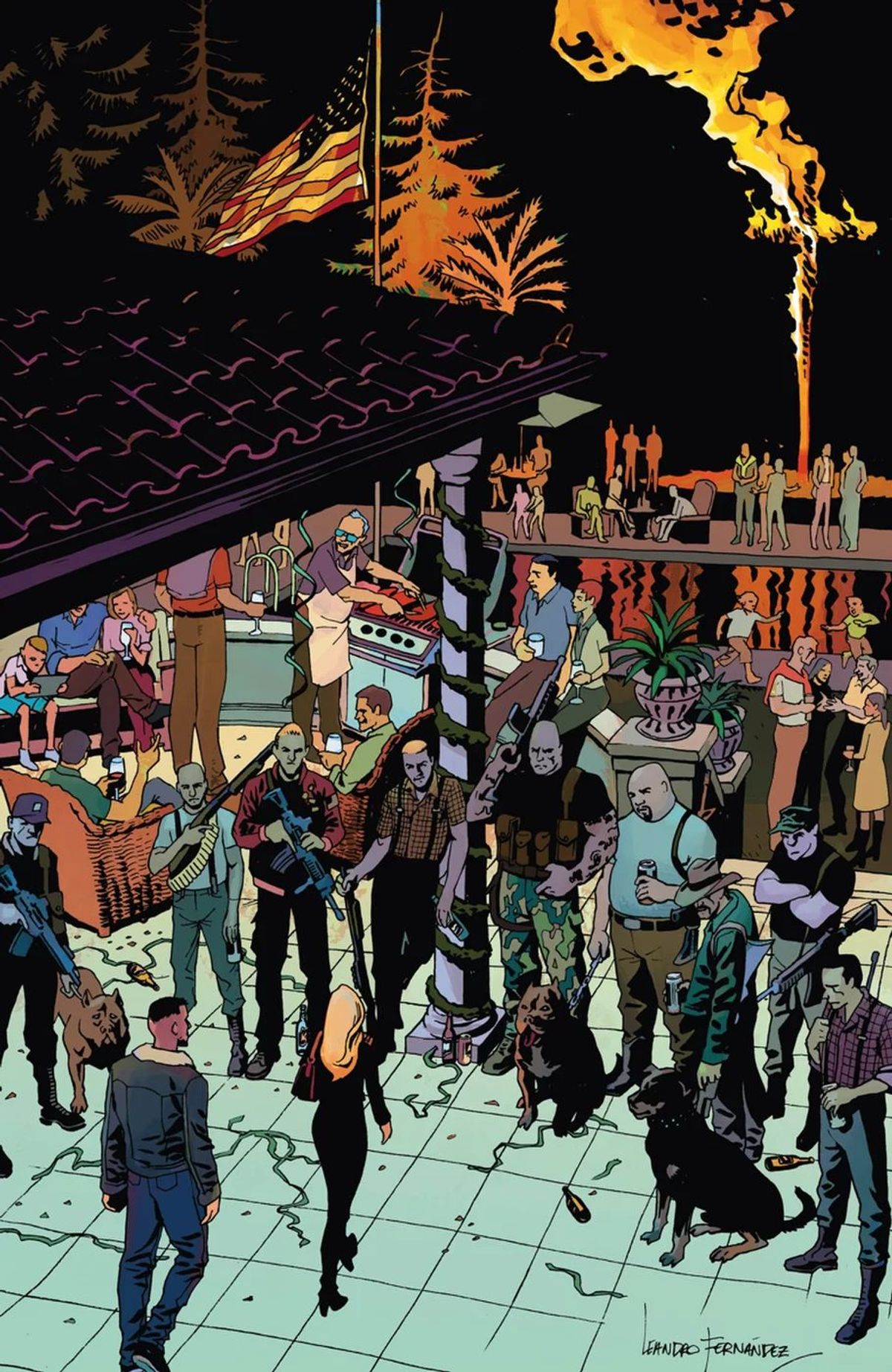 Hill - Di solito, questo genere di storie sono ambientate nel profondo sud degli Stati Uniti o nel cuore del Midwest, ma volevo esplorare gli aspetti californiani del movimento suprematista, del crimine e della politica, mescolare un po' le carte del mito dello stato utopisticamente liberale. Se scrivi una crime story, specialmente se la ambienti a Los Angeles, è impossibile non pensare a Michael Mann, probabilmente il mio regista preferito in forza della sua visione lirica del mondo moderno. In pratica, per lui tutto il mondo di oggi è la frontiera del West.Quindi ho detto a Leandro che volevo fare qualcosa che ponesse quel lirismo nelle pagine, che traslasse quella visione dello spazio nel fumetto. Volevo prendere l'approccio quasi alla Ansel Adams alla California e a Los Angeles e vedere cosa sarebbe successo, se saremmo riusciti a proporla come molto realistica e allo stesso tempo mitologica. Credo che Leandro e Dean White, il nostro colorista, abbiano fatto un lavoro ammirevole. E sono riusciti a rendere sia familiare che epico lo spazio.
