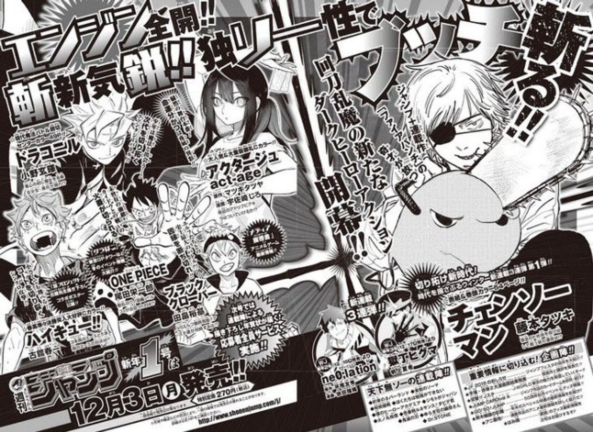 Il primo è Chainsaw Man, di Tatsuki Fujimoto, autore noto per Fire Punch, che esordirà sul primo numero datato 2019 della rivista, il quale uscirà il prossimo 3 dicembre. L’anteprima del manga, presentato come una storia d’azione con un eroe “oscuro”, pone ai lettori un interrogativo: quale sarà il destino di Denji, dopo aver sacrificato la propria vita e aver combattuto per ripagare il suo debito? A questa serie sarà dedicata anche la copertina del magazine, mentre il capitolo di debutto conterà cinquantaquattro pagine.Fujimoto ha precedentemente lavorato al manga Fire Punch, pubblicato da Shueisha tra aprile 2016 a gennaio 2018 sull’applicazione e sul sito di Shonen Jump+. Nel nostro Paese, questo fumetto è disponibile grazie a Star Comics.