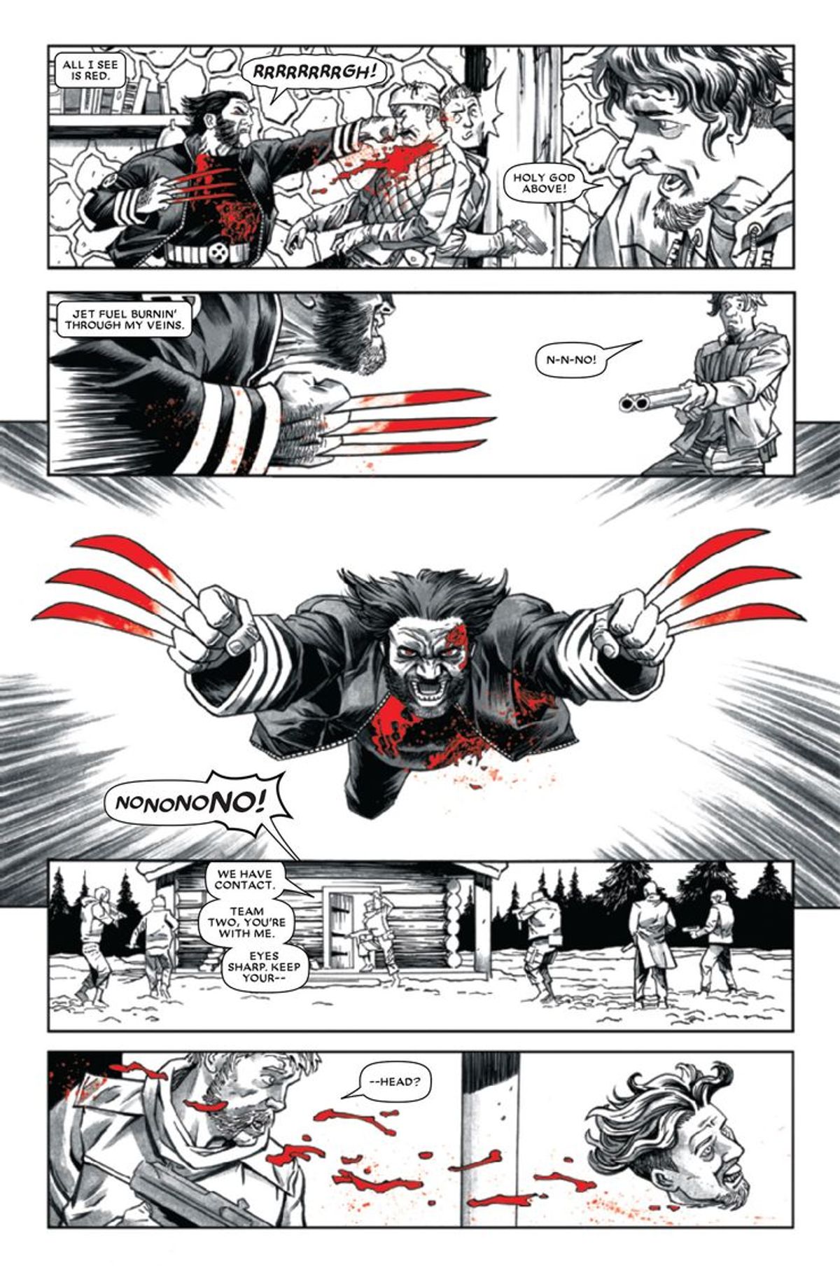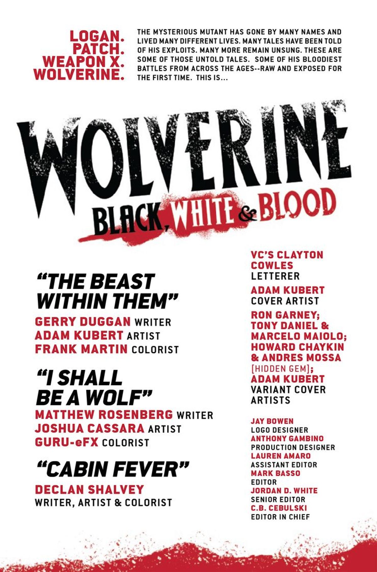 Logan. Arma X. Wolverine. Il misterioso mutante ha avuto molti nomi e ha vissuto tante vite diverse. Ora, ascoltate nuove storie mai raccontate prima, da una squadra di autori di primo piano, attraverso tavole in bianco e nero (con una sana spruzzata ovunque di rosso sangue). Ritornate ad Arma X con Gerry Dugan e Adam Kubert, per una nuova rivelazione dalla frammentaria memoria di Wolverine. Unitevi a Matthew Rosenberg e Joshua Cassara per un'esplosiva missione di spionaggio sotto copertura, con una collaborazione tra Wolverine e Nick Fury. Immergetevi nella natura selvaggia con l'autore completo Declan Shalvey mentre Logan si trova nel mezzo di una trappola mortale. Questo è quello che stavate aspettando, amici.