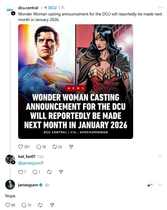 Il DC Universe di James Gunn continua a generare speculazioni e rumor a ritmo serrato. L'ultima voce che ha infiammato la comunità dei fan riguarda una possibile apparizione di Wonder Woman in Man of Tomorrow, il secondo film dedicato al Superman di David Corenswet, previsto nelle sale per il 9 luglio 2027. La risposta del co-CEO di DC Studios è arrivata rapida e secca, ma lascia spazio a qualche interrogativo che vale la pena approfondire. Tutto è partito da un thread su Threads, dove un utente ha chiesto direttamente a Gunn se fosse vero che il casting di Wonder Woman per Man of Tomorrow sarebbe stato annunciato a gennaio 2026. La risposta del regista è stata lapidaria: "Nope". Una parola sola, inequivocabile all'apparenza, che però potrebbe non chiudere definitivamente la questione.