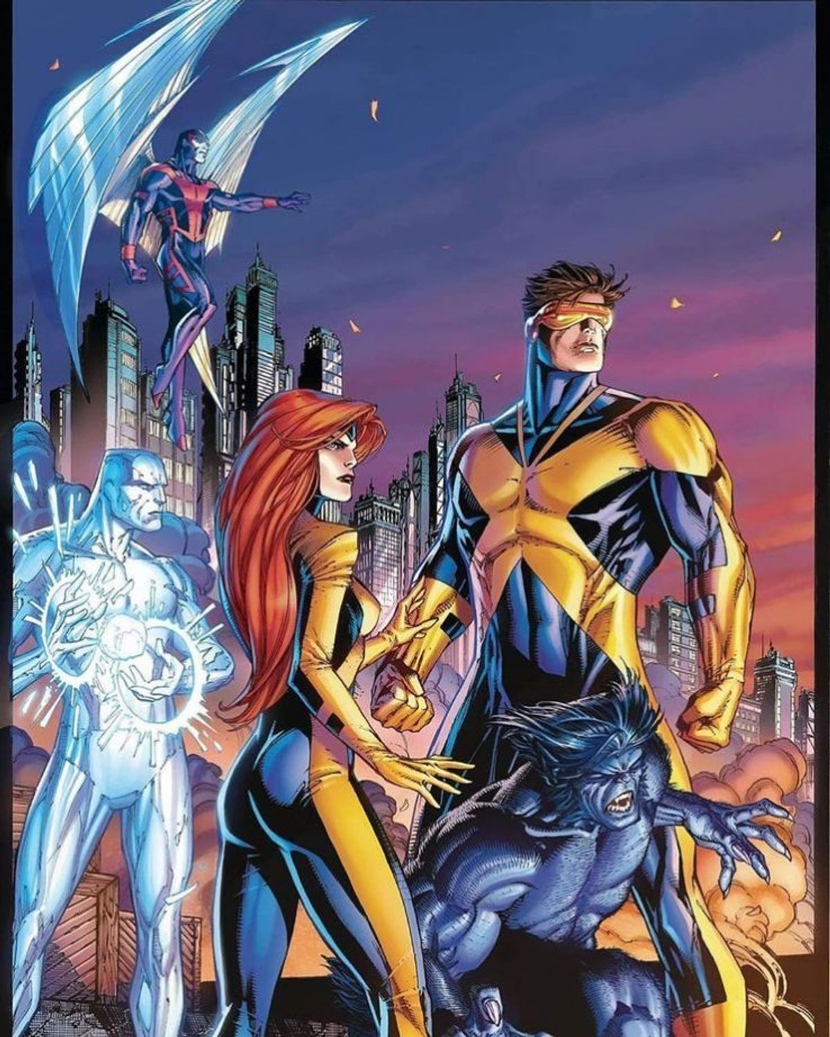 Tocca un'immagine per scorrere la galleriaL'illustrazione ha come soggetto la prima, storica formazione di X-Factor, composta da una rediviva Jean Grey, da Ciclope, Bestia, l’Uomo Ghiaccio e Arcangelo. Come avrete notato, i primi tre sono ritratti nelle stesse pose di Capitan America, di Wolverine e della Vedova Nera sulla sopracitata copertina del 1990.