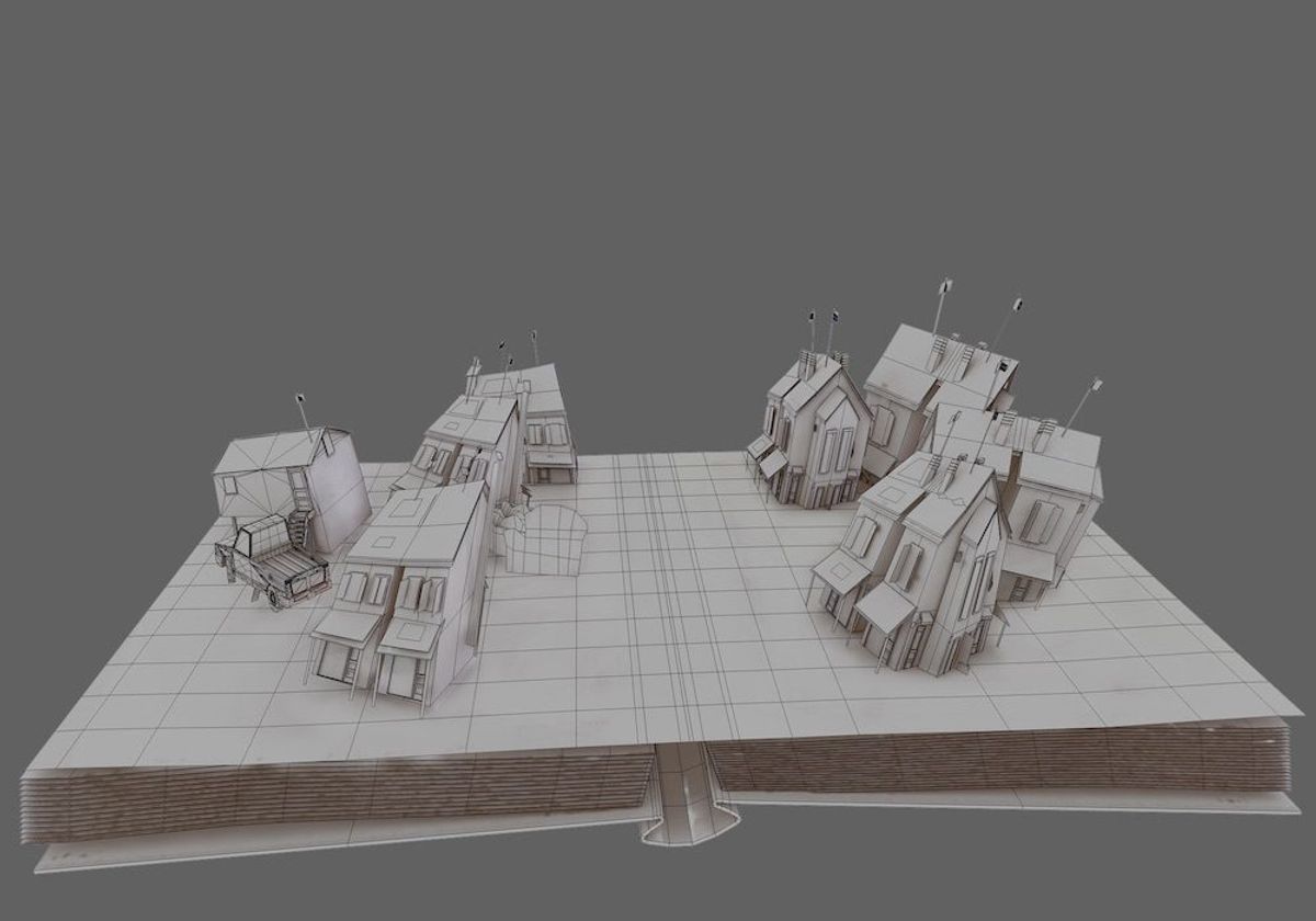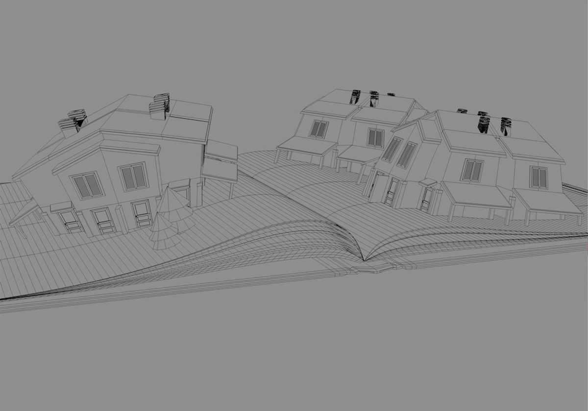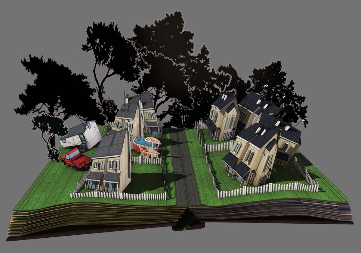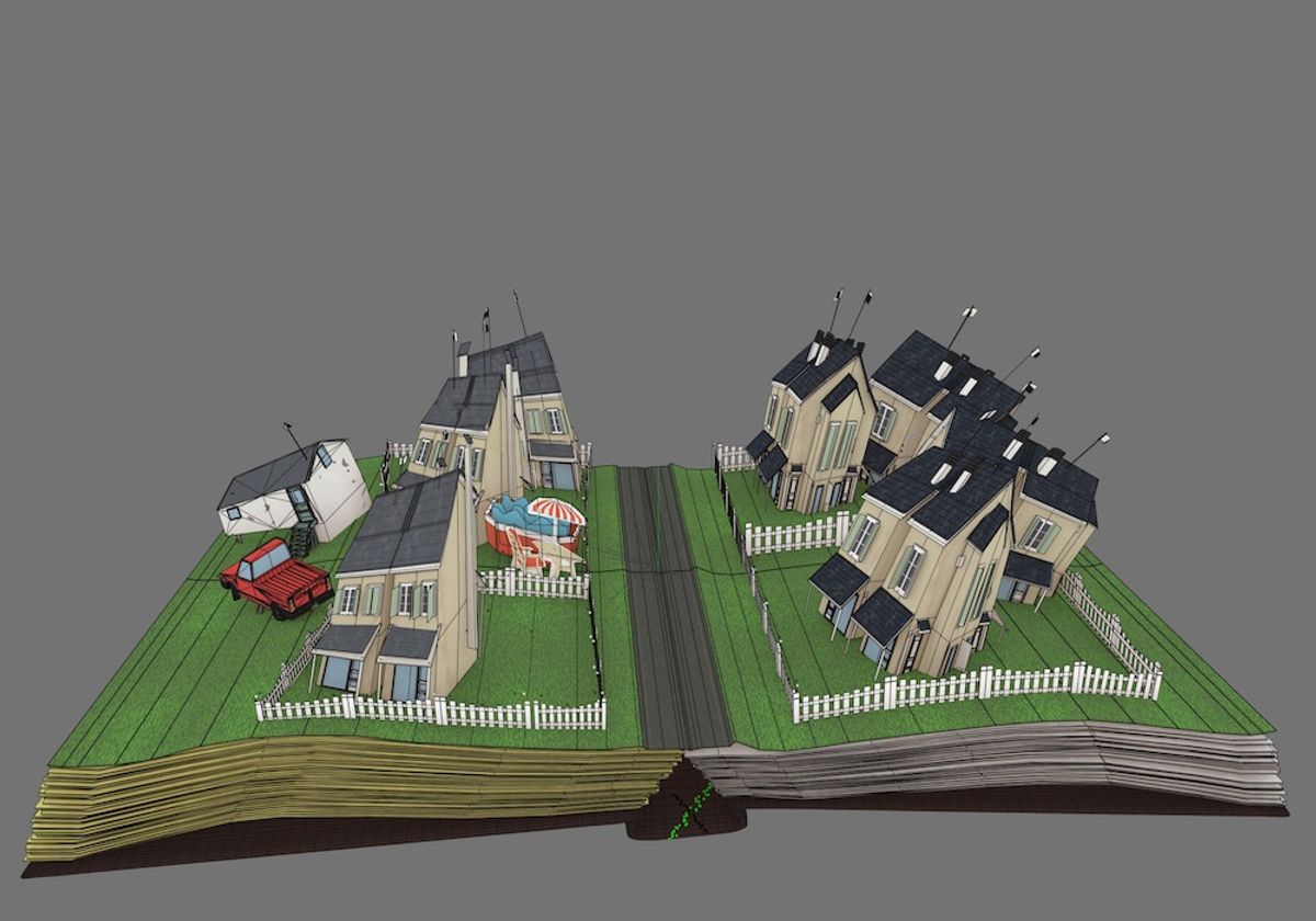 Lo step successivo è stato ricostruire tutto il quartiere al computer prendendo come riferimento i luoghi e le scene del film, le case, i personaggi, le staccionate sono proprio quelle. C’è anche un furgoncino particolare che rimanda ad una sequenza molto importante del racconto. Il risultato però non doveva essere un modellino in scala tipo “plastico” di un quartiere. Non doveva avere quella freddezza “materica”.