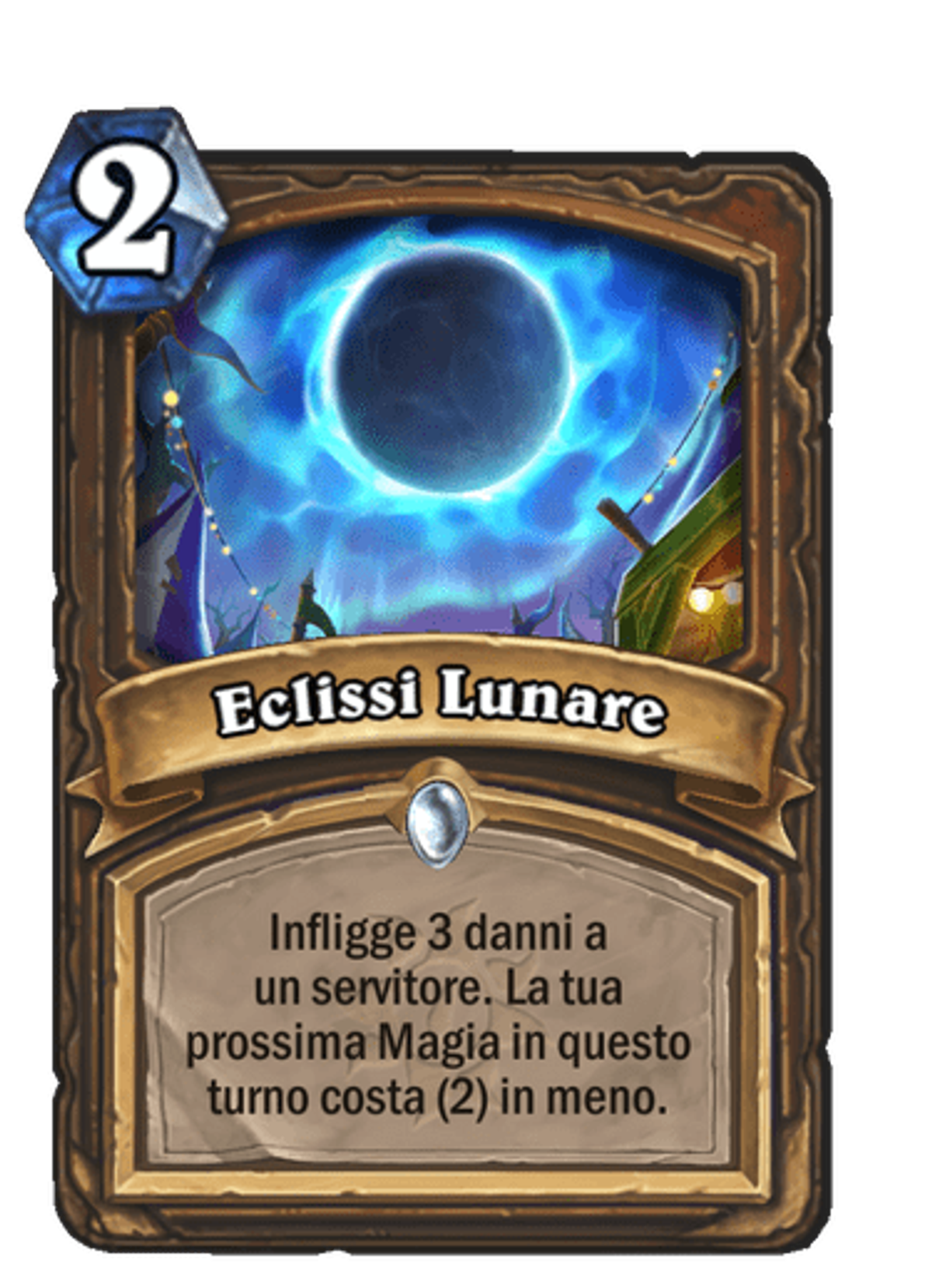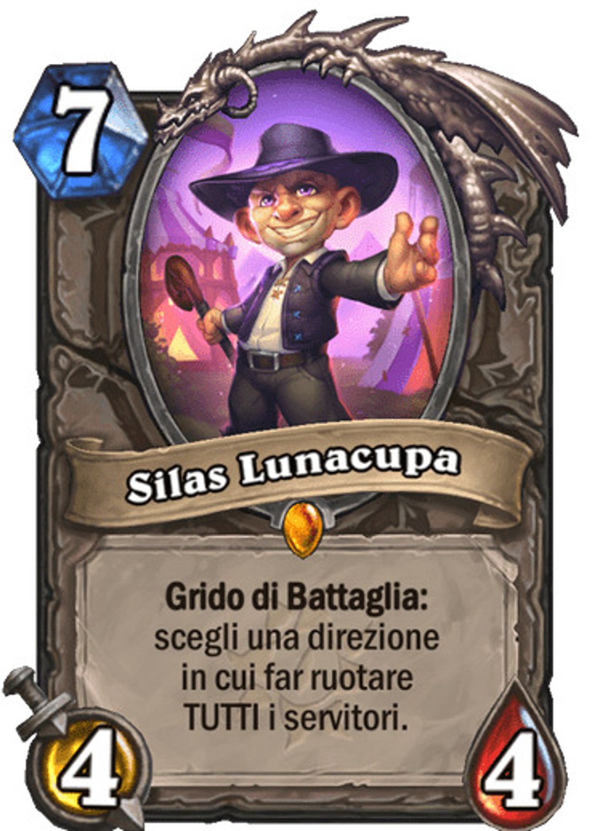 La quinta carta leggendaria presentata nel corso della diretta è Silas Lunacupa, servitore già disponibile per tutti da ieri sera, ottenibile semplicemente accedendo a Hearthstone. Si tratta di una generica 7 Mana 4/4 che una volta giocata permette di ruotare i servitori in campo in senso orario o antiorario (a nostra scelta) per cedere un servitore all'avversario e, al contempo, rubargliene uno. Silas è una tech-card sicuramente molto interessante e per nulla scontata né semplice da utilizzare: bisogna non solo trovare il momento giusto per far scendere Silas in campo, ma anche preparare il suo arrivo imbastendo una board non troppo ghiotta per evitare di cedere al nostro rivale una carta chiave. Abbiamo già avuto modo di provare brevemente Silas, questa mattina, e se giocato al momento giusto può davvero cambiare le sorti del match.Tra le altre carte presentate ieri sera (12 in totale) spicca un'ultima leggendaria, questa volta del Druido: stiamo parlando di Kiri, Prescelto di Elune, servitore 4 Mana 2/2 che mette nella mano di chi la gioca un'Eclissi Solare e un'Eclissi Lunare, due carta dal costo di 2 Mana che citano, rispettivamente: "La tua prossima Magia in questo turno viene lanciata due volte" e "Infligge 3 danni a un servitore; la tua prossima Magia in questo turno costa (2) in meno". Non proprio la carta di cui il Druido aveva bisogno, diciamocelo, ma sicuramente in linea con la direzione e l'identità di classe scelta da Blizzard.