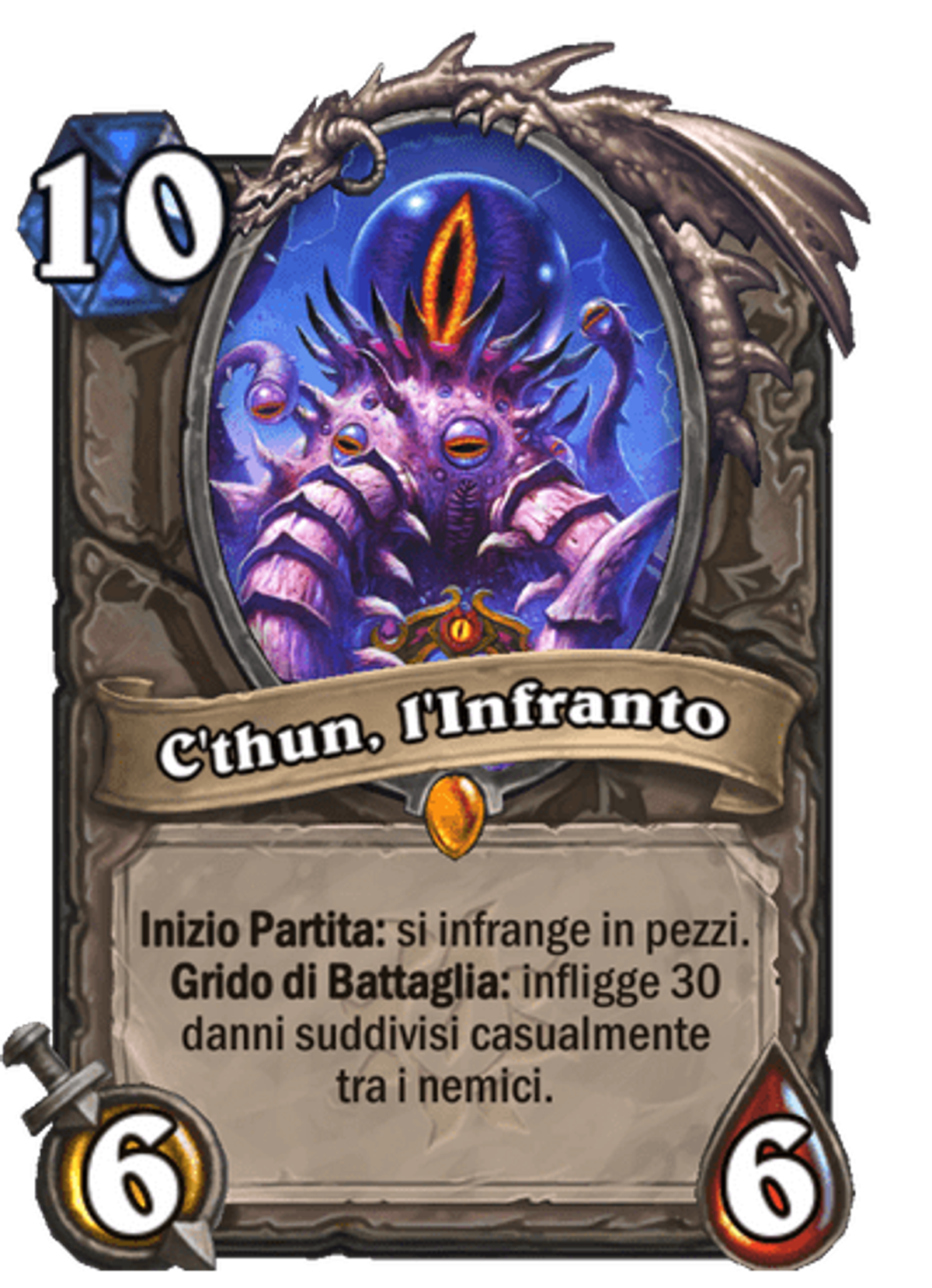 Per quanto riguarda gli altri tre Dei Antichi, il nuovo N'zoth, Dio degli Abissi resuscita un servitore differente per ogni tipo, e non più solamente i servitori con Rantolo di Morte, mentre Y'shaarj, il Profanatore, mette nella nostra mano una copia di ogni carta Corrotta giocata nella partita, che costa (0) per quel turno, non evocando più servitori dal mazzo. C'thun, l'Infranto, invece, non ha più bisogno di essere potenziato giocando servitori che ne aumentino le statistiche (e quindi l'output di danni), bensì a inizio partita s'infrange in 5 pezzi che vanno a mescolarsi nel mazzo e che, una volta pescati tutti quanti, si ricompongono in C'thun; una volta giocato, poi, C'thun infligge ben 30 danni suddivisi casualmente tra i nemici.