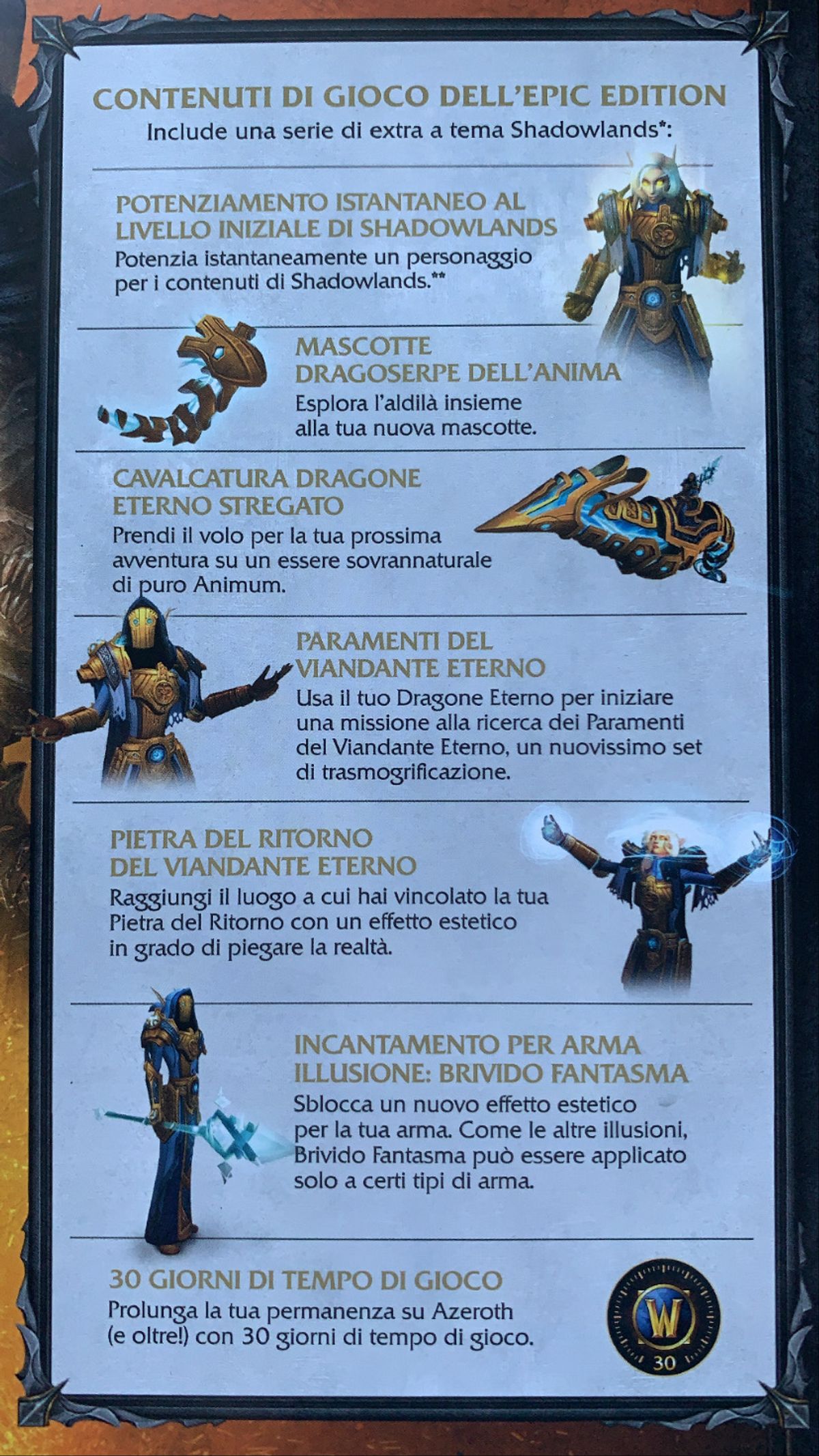 Il vero piatto forte, però, quello a cui puntano gli avventurieri più hardcore di Azeroth, è ovviamente l'Epic Edition di Shadowlands, la versione dell'espansione più completa ideata da Blizzard, comprendente un'eccellente dose di contenuti in-game come il potenziamento istantaneo di un personaggio fino al livello iniziale di Shadowlands, la mascotte Dragoserpe dell'Anima, la cavalcatura Dragone Eterno Stregato (che non vediamo l'ora di provare), una missione esclusiva che vi condurrà alla ricerca del Viandante Eterno, un effetto estetico in grado di piegare la realtà per la Pietra del Ritorno (Hearthstone vi dice nulla?), un incantamento per arma rinominato Brivido Fantasma e ovviamente un abbonamento di 30 giorni di gioco.